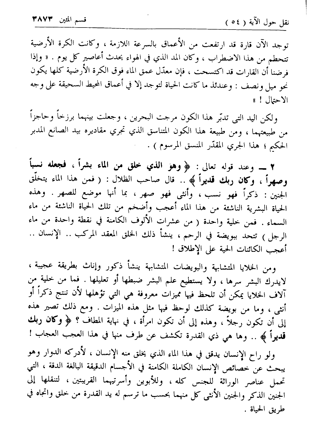 2 - وعند قوله تعالى: وَهُوَ الَّذِي خَلَقَ مِنَ الْماءِ بَشَراً، فَجَعَلَهُ نَسَباً وَصِهْراً، وَكانَ رَبُّكَ قَدِيراً .. قال صاحب الظلال: (فمن هذا الماء يتخلق الجنين: ذكرا فهو نسب، وأنثى فهو صهر، بما أنها موضع للصهر. وهذه الحياة البشرية الناشئة من هذا الماء أعجب وأضخم من تلك الحياة الناشئة من ماء السماء. فمن خلية واحدة (من عشرات الألوف الكامنة في نقطة واحدة من ماء الرجل) تتحد ببويضة في الرحم، ينشأ ذلك الخلق المعقد المركب .. الإنسان ..