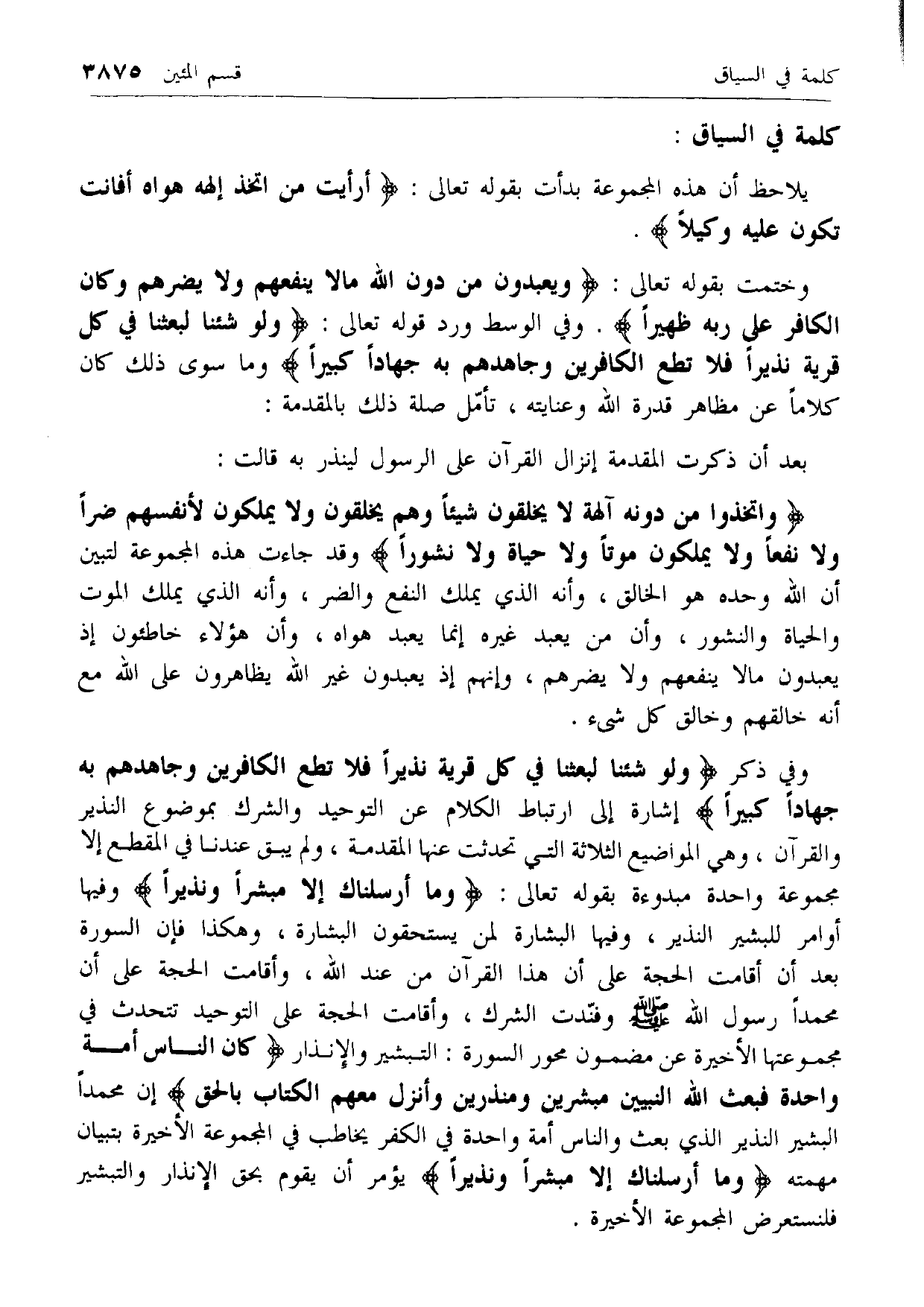 وختمت بقوله تعالى: وَيَعْبُدُونَ مِنْ دُونِ اللَّهِ ما لا يَنْفَعُهُمْ وَلا يَضُرُّهُمْ وَكانَ الْكافِرُ عَلى رَبِّهِ ظَهِيراً. وفي الوسط ورد قوله تعالى: وَلَوْ شِئْنا لَبَعَثْنا فِي كُلِّ قَرْيَةٍ نَذِيراً فَلا تُطِعِ الْكافِرِينَ وَجاهِدْهُمْ بِهِ جِهاداً كَبِيراً وما سوى ذلك كان كلاما عن مظاهر قدرة الله وعنايته، تأمل صلة ذلك بالمقدمة: