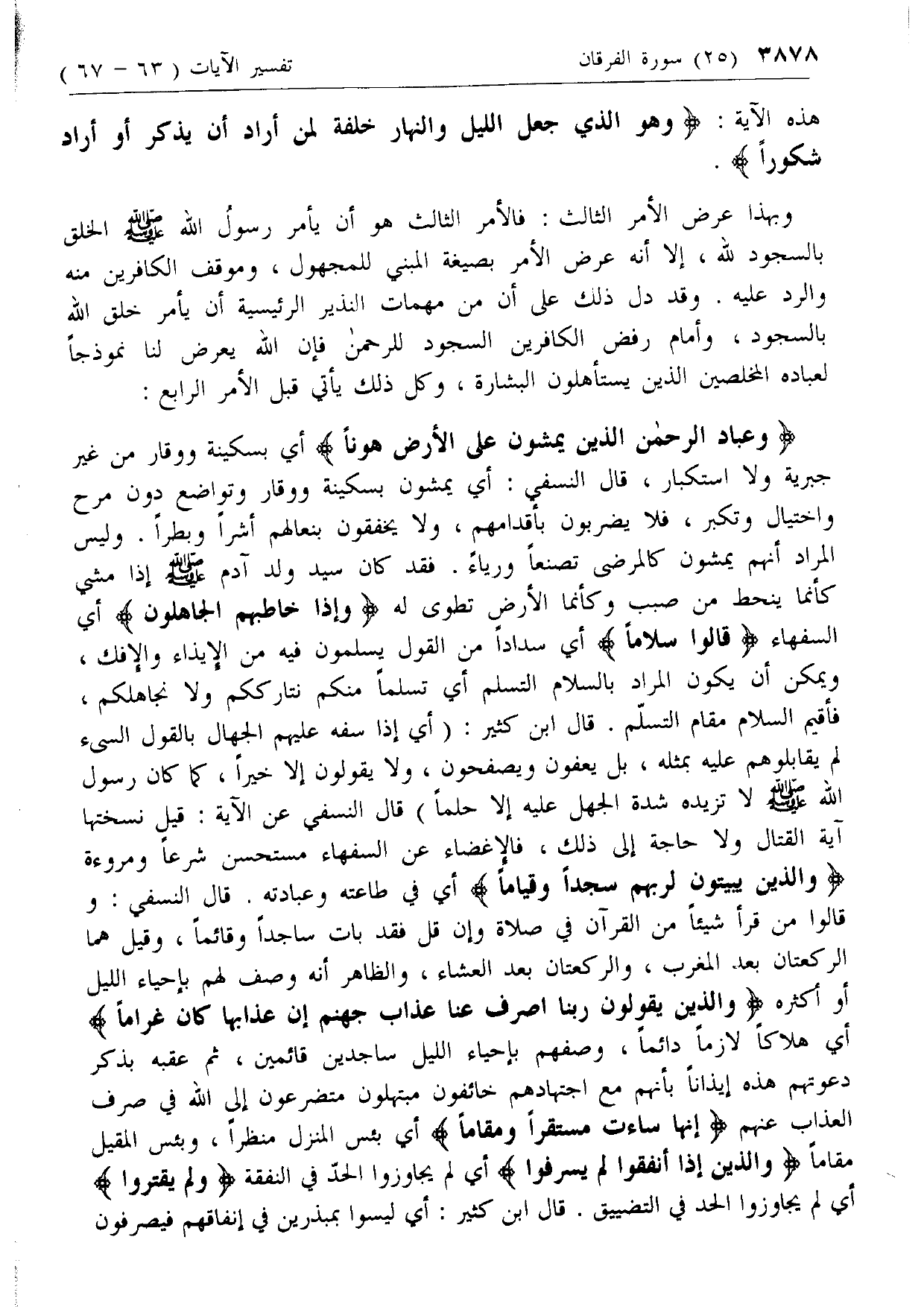 وَعِبادُ الرَّحْمنِ الَّذِينَ يَمْشُونَ عَلَى الْأَرْضِ هَوْناً أي بسكينة ووقار من غير جبرية ولا استكبار، قال النسفي: أي يمشون بسكينة ووقار وتواضع دون مرح واختيال وتكبر، فلا يضربون بأقدامهم، ولا يخفقون بنعالهم أشرا وبطرا. وليس المراد أنهم يمشون كالمرضى تصنعا ورياء. فقد كان سيد ولد آدم صلى الله عليه وسلم إذا مشي كأنما ينحط من صبب وكأنما الأرض تطوى له وَإِذا خاطَبَهُمُ الْجاهِلُونَ أي السفهاء قالُوا سَلاماً أي سدادا من القول يسلمون فيه من الإيذاء والإفك، ويمكن أن يكون المراد بالسلام التسلم أي تسلما منكم نتارككم ولا نجاهلكم، فأقيم السلام مقام التسلم. قال ابن كثير: (أي إذا سفه عليهم الجهال بالقول السيئ لم يقابلوهم عليه بمثله، بل يعفون ويصفحون، ولا يقولون إلا خيرا، كما كان رسول الله صلى الله عليه وسلم لا تزيده شدة الجهل عليه إلا حلما) قال النسفي عن الآية: قيل نسختها آية القتال ولا حاجة إلى ذلك، فالإغضاء عن السفهاء مستحسن شرعا ومروءة