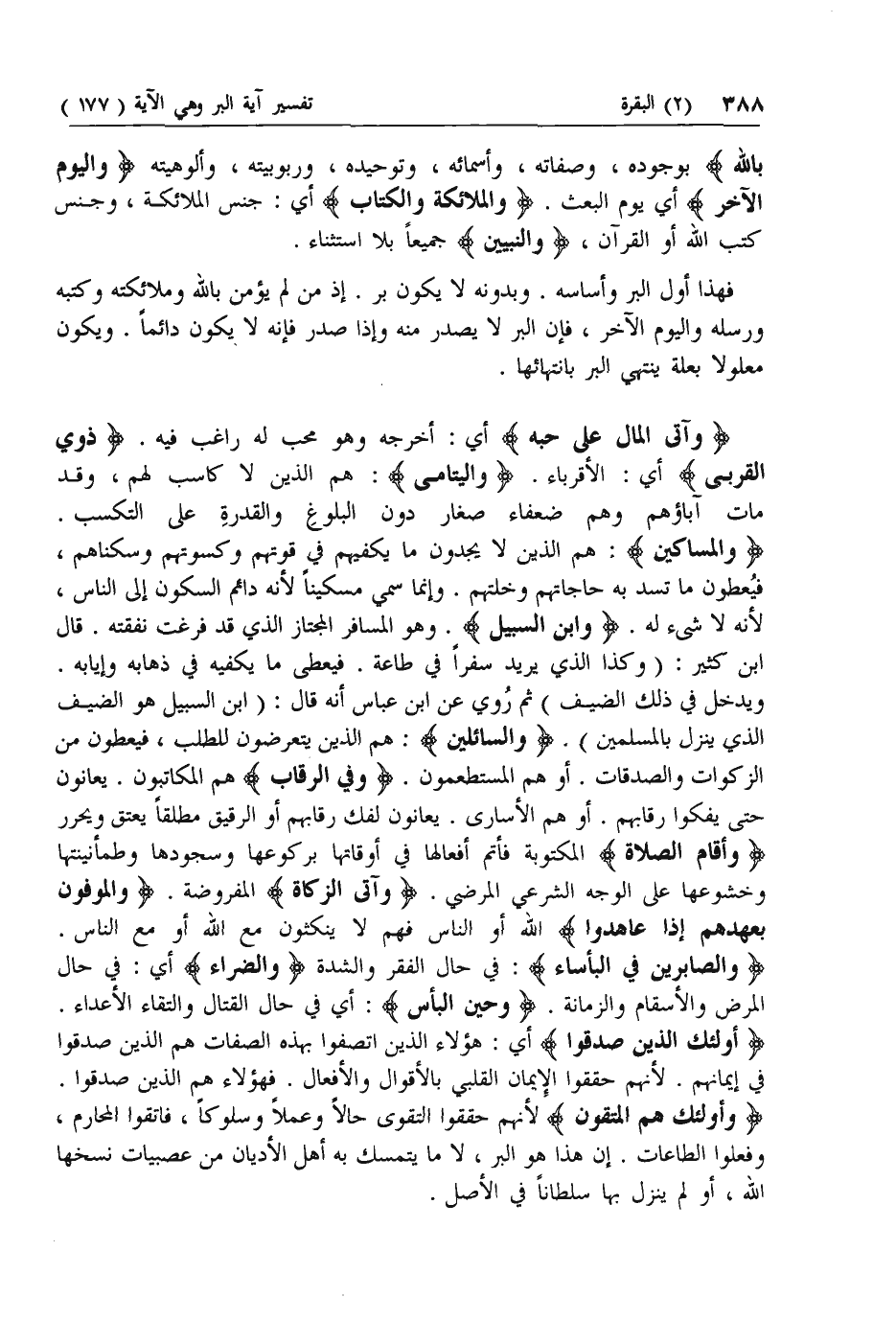 ويدخل في ذلك الضيف) ثم روي عن ابن عباس أنه قال: (ابن السبيل هو الضيف الذي ينزل بالمسلمين). وَالسَّائِلِينَ: هم الذين يتعرضون للطلب، فيعطون من الزكوات والصدقات. أو هم المستطعمون. وَفِي الرِّقابِ هم المكاتبون. يعانون حتى يفكوا رقابهم. أو هم الأسارى. يعانون لفك رقابهم أو الرقيق مطلقا يعتق ويحرر وَأَقامَ الصَّلاةَ المكتوبة فأتم أفعالها في أوقاتها بركوعها وسجودها وطمأنينتها وخشوعها على الوجه الشرعي المرضي. وَآتَى الزَّكاةَ المفروضة. وَالْمُوفُونَ بِعَهْدِهِمْ إِذا عاهَدُوا الله أو الناس فهم لا ينكثون مع الله أو مع الناس.