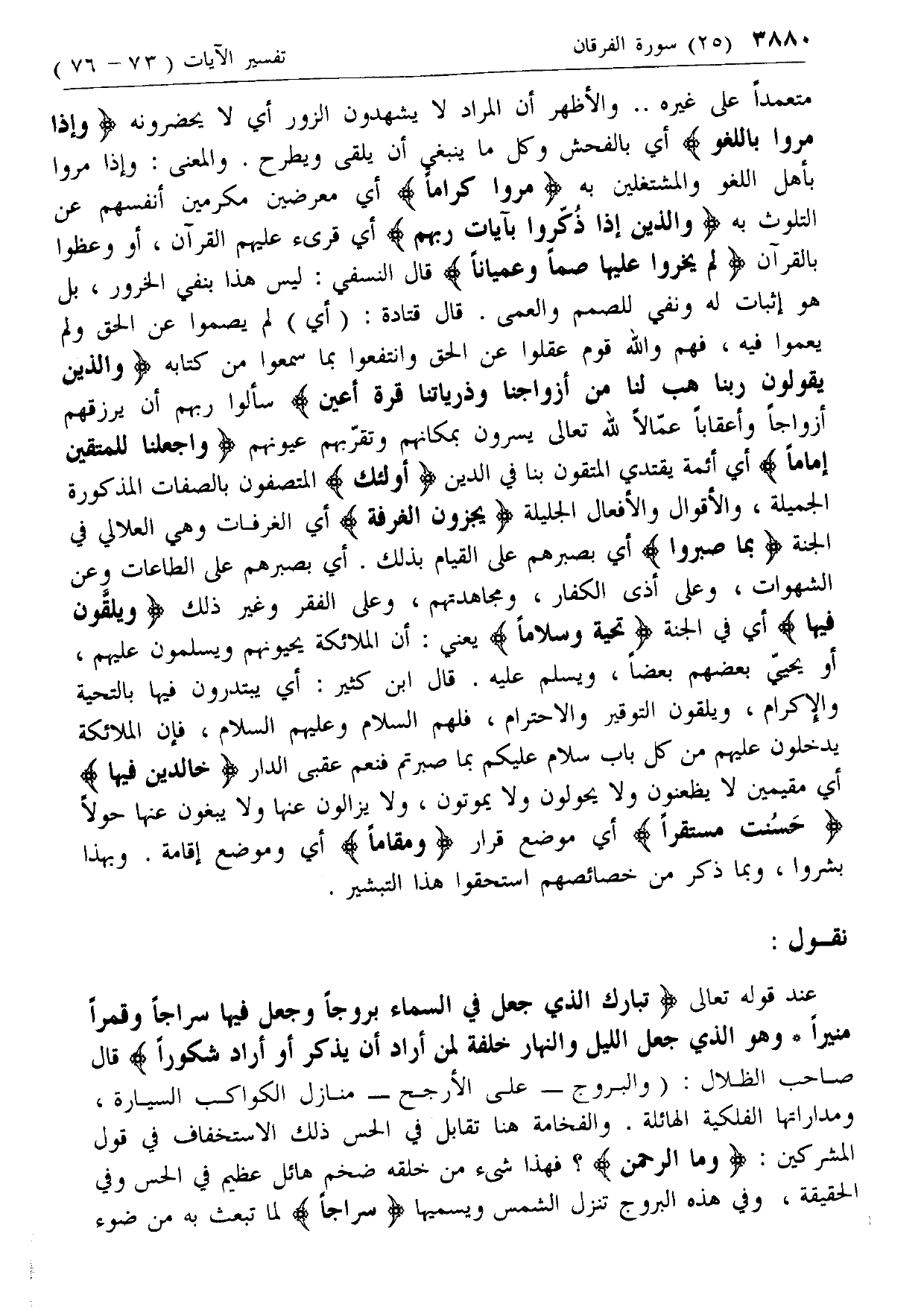 عند قوله تعالى تَبارَكَ الَّذِي جَعَلَ فِي السَّماءِ بُرُوجاً وَجَعَلَ فِيها سِراجاً وَقَمَراً مُنِيراً* وَهُوَ الَّذِي جَعَلَ اللَّيْلَ وَالنَّهارَ خِلْفَةً لِمَنْ أَرادَ أَنْ يَذَّكَّرَ أَوْ أَرادَ شُكُوراً قال صاحب الظلال: (والبروج- على الأرجح- منازل الكواكب السيارة، ومداراتها الفلكية الهائلة. والفخامة هنا تقابل في الحس ذلك الاستخفاف في قول المشركين: وَمَا الرَّحْمنُ؟ فهذا شئ من خلقه ضخم هائل عظيم في الحس وفي الحقيقة، وفي هذه البروج تنزل الشمس ويسميها سِراجاً لما تبعث به من ضوء