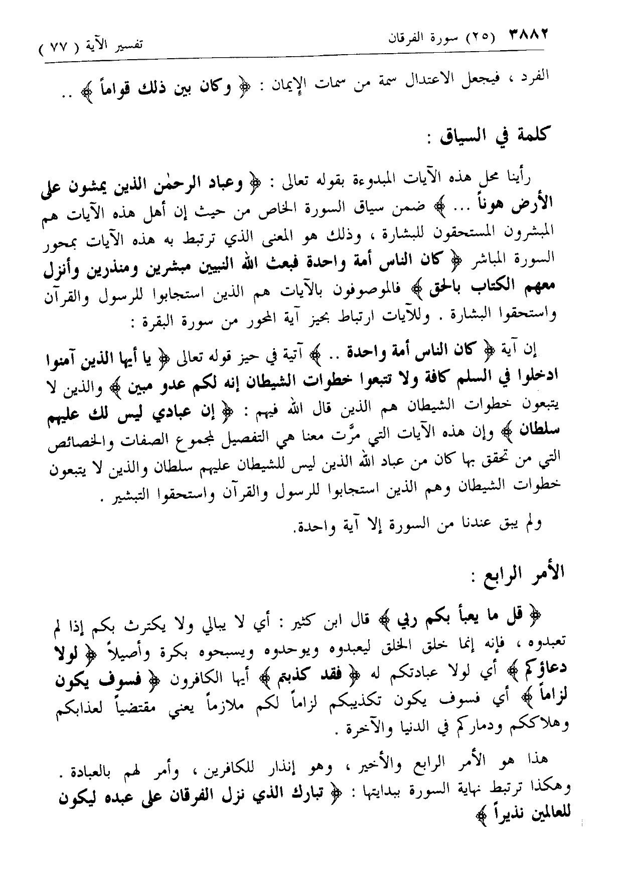رأينا محل هذه الآيات المبدوءة بقوله تعالى: وَعِبادُ الرَّحْمنِ الَّذِينَ يَمْشُونَ عَلَى الْأَرْضِ هَوْناً ... ضمن سياق السورة الخاص من حيث إن أهل هذه الآيات هم المبشرون المستحقون للبشارة، وذلك هو المعنى الذي ترتبط به هذه الآيات بمحور السورة المباشر كانَ النَّاسُ أُمَّةً واحِدَةً فَبَعَثَ اللَّهُ النَّبِيِّينَ مُبَشِّرِينَ وَمُنْذِرِينَ وَأَنْزَلَ مَعَهُمُ