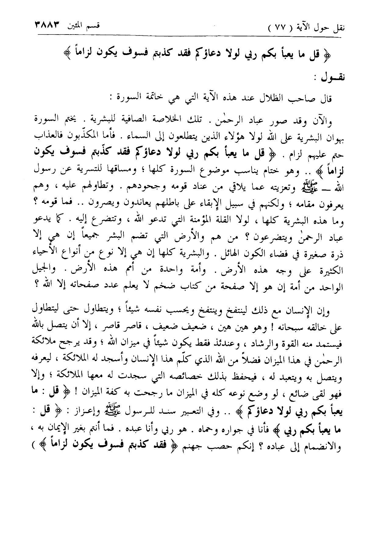 وإن الإنسان مع ذلك لينتفخ وينتفخ ويحسب نفسه شيئا؛ ويتطاول حتى ليتطاول على خالقه سبحانه! وهو هين هين، ضعيف ضعيف، قاصر قاصر، إلا أن يتصل بالله فيستمد منه القوة والرشاد، وعندئذ فقط يكون شيئا في ميزان الله؛ وقد يرجح ملائكة الرحمن في هذا الميزان فضلا من الله الذي كلم هذا الإنسان وأسجد له الملائكة، ليعرفه ويتصل به ويتعبد له، فيحفظ بذلك خصائصه التي سجدت له معها الملائكة؛ وإلا فهو لقى ضائع، لو وضع نوعه كله في الميزان ما رجحت به كفة الميزان! قُلْ: ما يَعْبَؤُا بِكُمْ رَبِّي لَوْلا دُعاؤُكُمْ .. وفي التعبير سند للرسول صلى الله عليه وسلم وإعزاز: قُلْ: ما يَعْبَؤُا بِكُمْ رَبِّي فأنا في جواره وحماه. هو ربي وأنا عبده. فما أنتم بغير الإيمان به، والانضمام إلى عباده؟ إنكم حصب جهنم فَقَدْ كَذَّبْتُمْ فَسَوْفَ يَكُونُ لِزاماً)