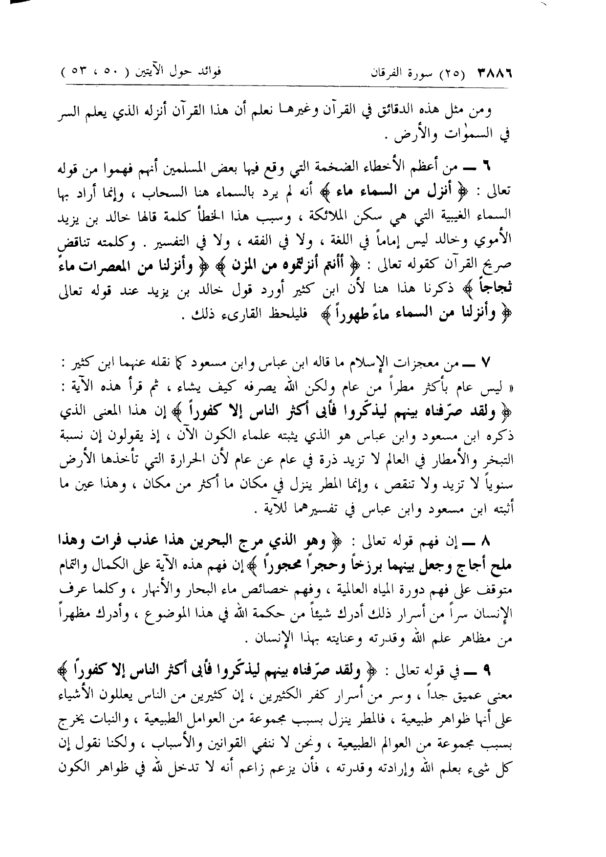 9 - في قوله تعالى: وَلَقَدْ صَرَّفْناهُ بَيْنَهُمْ لِيَذَّكَّرُوا فَأَبى أَكْثَرُ النَّاسِ إِلَّا كُفُوراً معنى عميق جدا، وسر من أسرار كفر الكثيرين، إن كثيرين من الناس يعللون الأشياء على أنها ظواهر طبيعية، فالمطر ينزل بسبب مجموعة من العوامل الطبيعية، والنبات يخرج بسبب مجموعة من العوالم الطبيعية، ونحن لا ننفي القوانين والأسباب، ولكنا نقول إن كل شئ بعلم الله وإرادته وقدرته، فإن يزعم زاعم أنه لا تدخل لله في ظواهر الكون