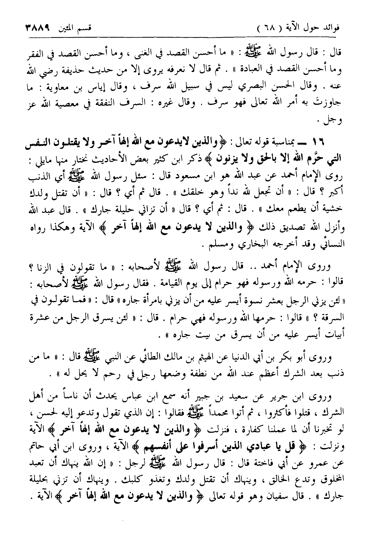 16 - بمناسبة قوله تعالى: وَالَّذِينَ لا يَدْعُونَ مَعَ اللَّهِ إِلهاً آخَرَ وَلا يَقْتُلُونَ النَّفْسَ الَّتِي حَرَّمَ اللَّهُ إِلَّا بِالْحَقِّ وَلا يَزْنُونَ ذكر ابن كثير بعض الأحاديث نختار منها ما يلي: