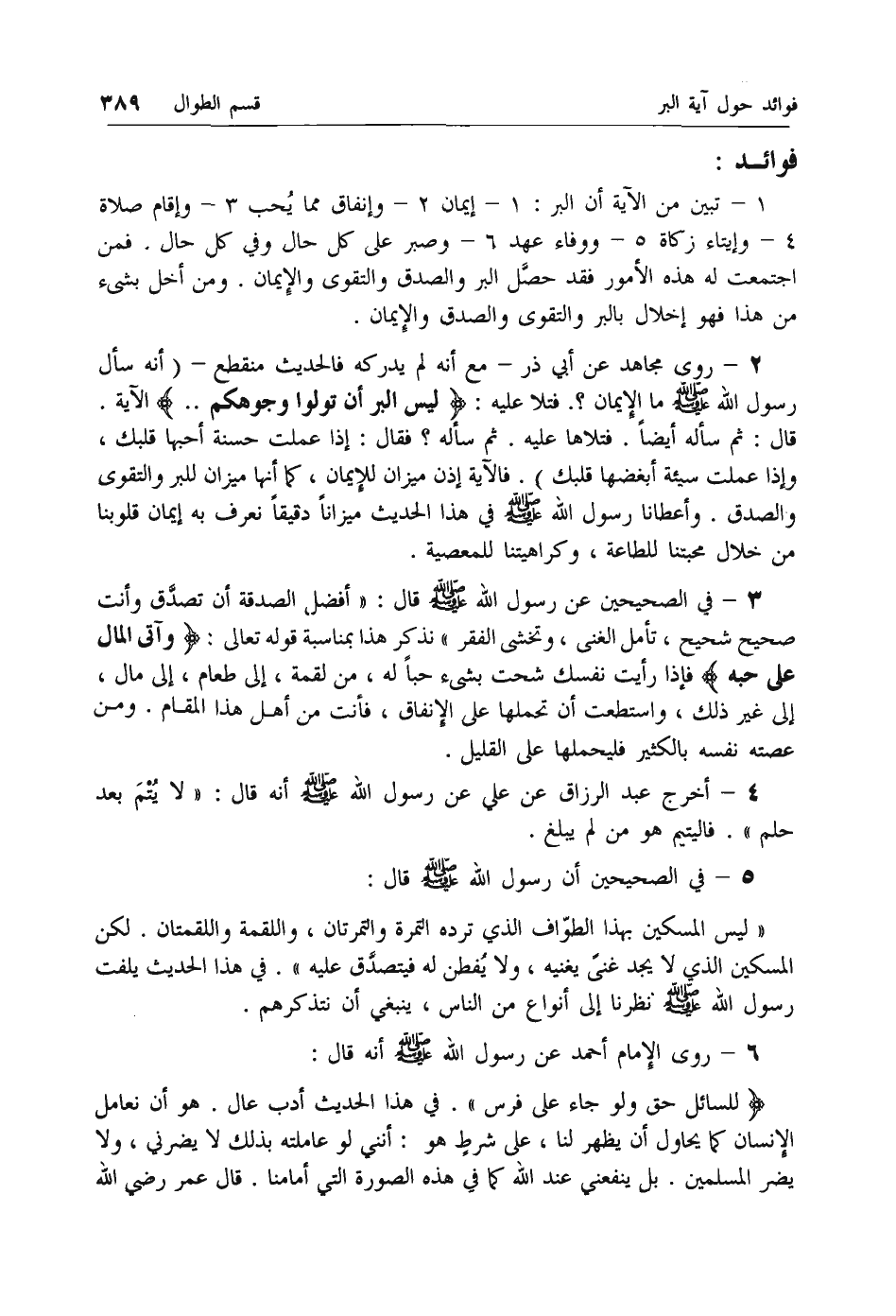 قال: ثم سأله أيضا. فتلاها عليه. ثم سأله؟ فقال: إذا عملت حسنة أحبها قلبك، وإذا عملت سيئة أبغضها قلبك). فالآية إذن ميزان للإيمان، كما أنها ميزان للبر والتقوى والصدق. وأعطانا رسول الله صلى الله عليه وسلم في هذا الحديث ميزانا دقيقا نعرف به إيمان قلوبنا من خلال محبتنا للطاعة، وكراهيتنا للمعصية.