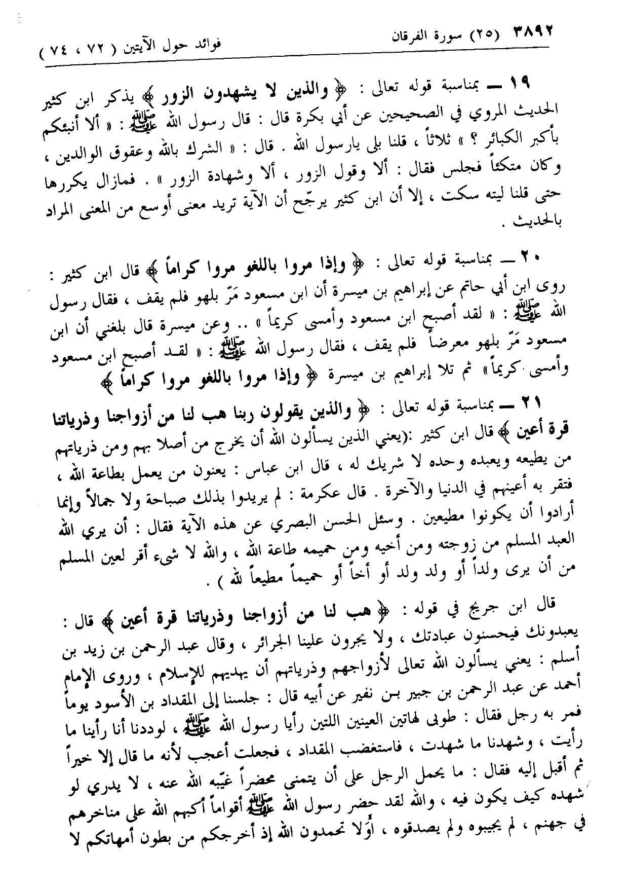 19 - بمناسبة قوله تعالى: وَالَّذِينَ لا يَشْهَدُونَ الزُّورَ يذكر ابن كثير الحديث المروي في الصحيحين عن أبي بكرة قال: قال رسول الله صلى الله عليه وسلم: «ألا أنبئكم بأكبر الكبائر؟» ثلاثا، قلنا بلى يا رسول الله. قال: «الشرك بالله وعقوق الوالدين، وكان متكئا فجلس فقال: ألا وقول الزور، ألا وشهادة الزور». فما زال يكررها حتى قلنا ليته سكت، إلا أن ابن كثير يرجح أن الآية تريد معنى أوسع من المعنى المراد بالحديث.