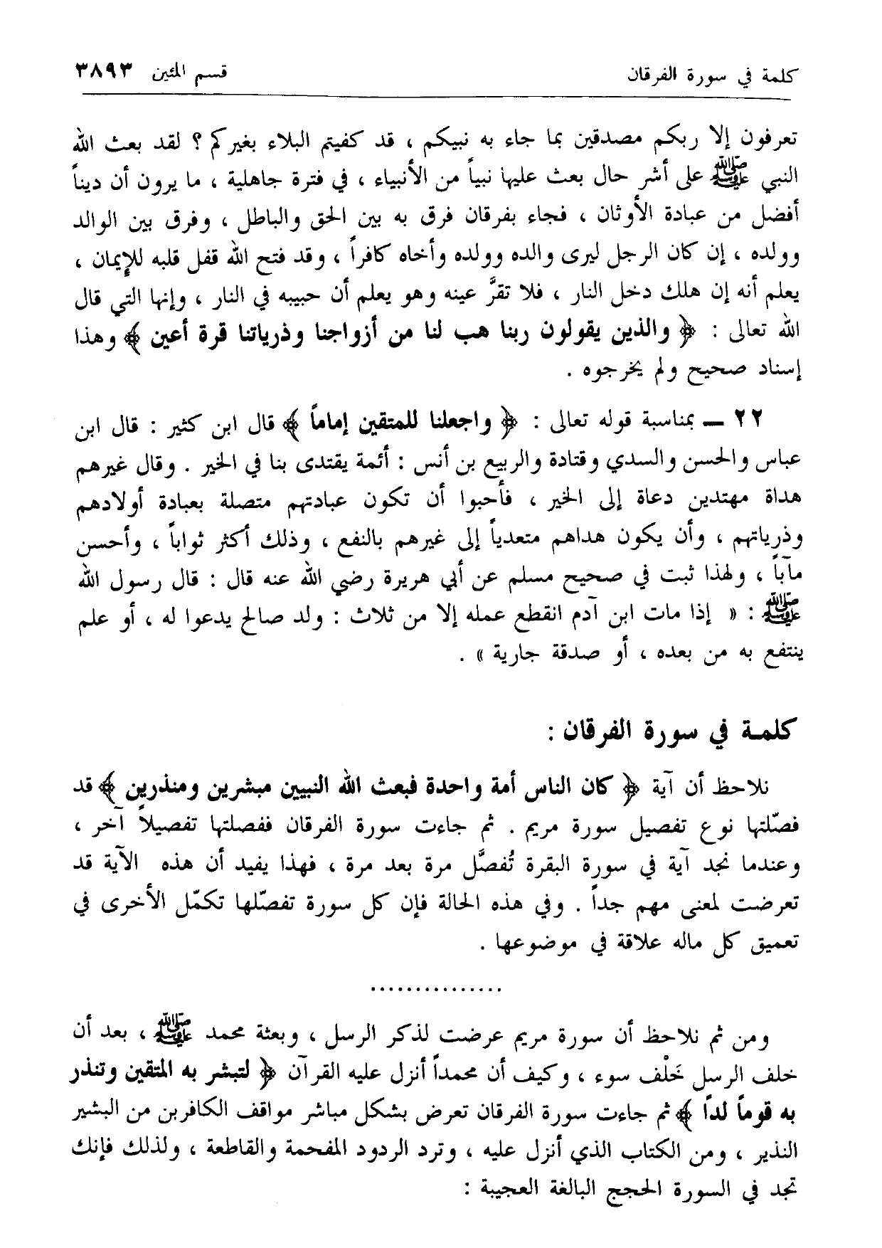 22 - بمناسبة قوله تعالى: وَاجْعَلْنا لِلْمُتَّقِينَ إِماماً قال ابن كثير: قال ابن عباس والحسن والسدي وقتادة والربيع بن أنس: أئمة يقتدى بنا في الخير. وقال غيرهم هداة مهتدين دعاة إلى الخير، فأحبوا أن تكون عبادتهم متصلة بعبادة أولادهم وذرياتهم، وأن يكون هداهم متعديا إلى غيرهم بالنفع، وذلك أكثر ثوابا، وأحسن مآبا، ولهذا ثبت في صحيح مسلم عن أبي هريرة رضي الله عنه قال: قال رسول الله صلى الله عليه وسلم: «إذا مات ابن آدم انقطع عمله إلا من ثلاث: ولد صالح يدعوا له، أو علم ينتفع به من بعده، أو صدقة جارية».