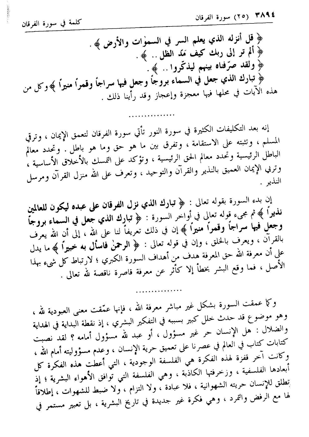إنه بعد التكليفات الكثيرة في سورة النور تأتي سورة الفرقان لتعمق الإيمان، وترقي المسلم، وتثبته على الاستقامة، وتفرق بين ما هو حق وما هو باطل. وتحدد معالم الباطل الرئيسية وتحدد معالم الحق الرئيسية، وتؤكد على التمسك بالأخلاق الأساسية، وتربي الإيمان العميق بالنذير والقرآن والتوحيد، وتعرف على الله منزل القرآن ومرسل النذير.