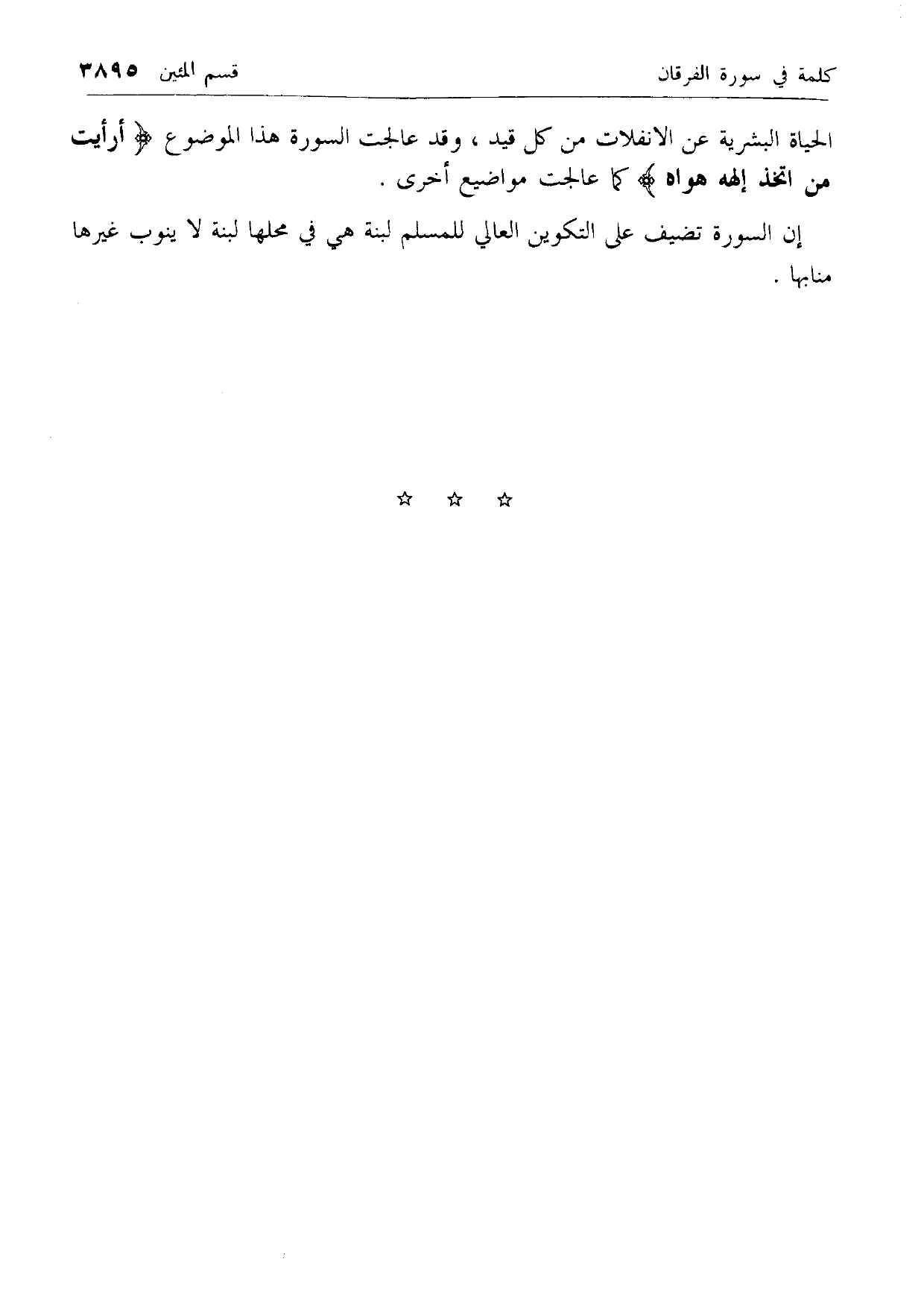 الحياة البشرية عن الانفلات من كل قيد، وقد عالجت السورة هذا الموضوع أَرَأَيْتَ مَنِ اتَّخَذَ إِلهَهُ هَواهُ كما عالجت مواضيع أخرى.