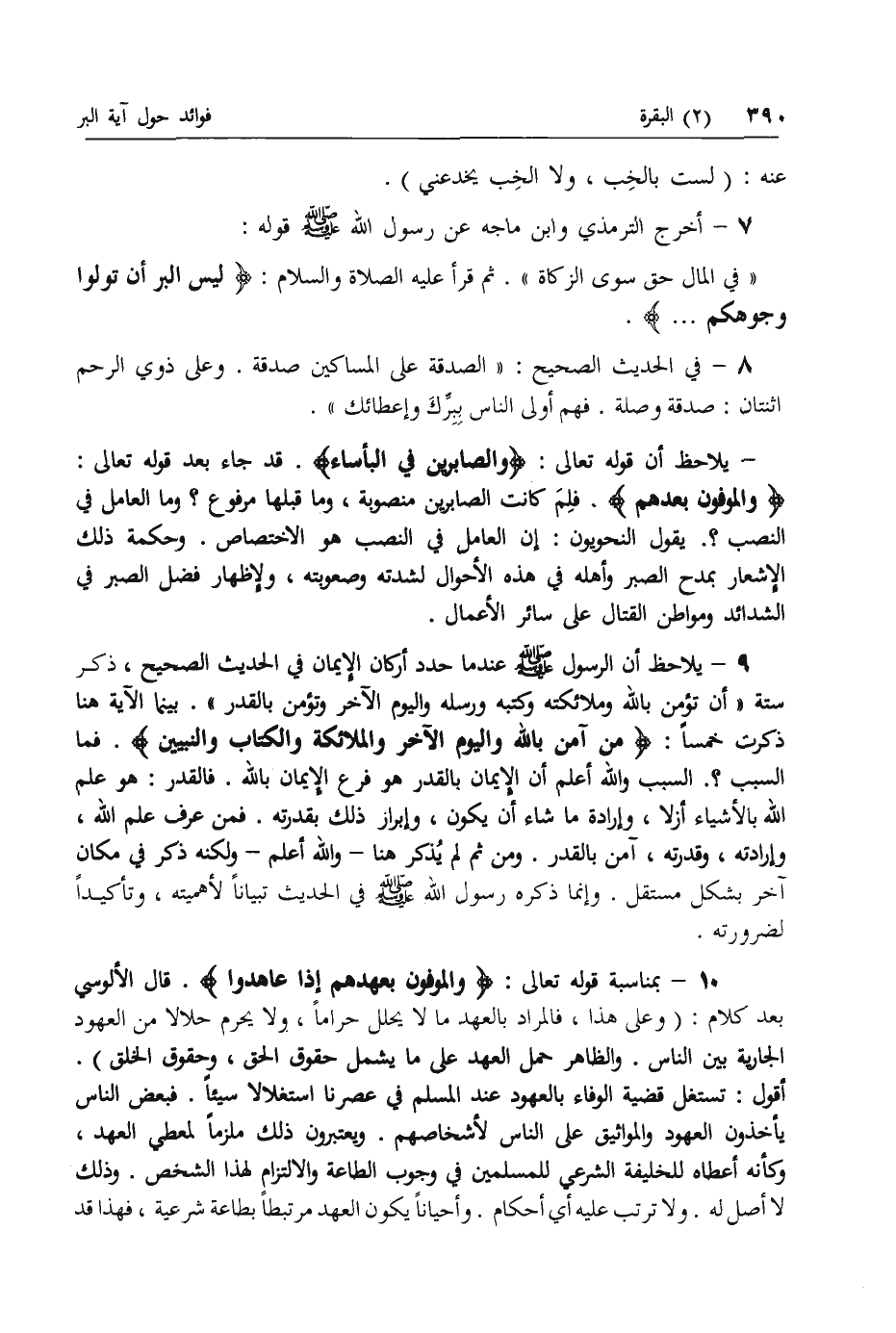 10 - بمناسبة قوله تعالى: وَالْمُوفُونَ بِعَهْدِهِمْ إِذا عاهَدُوا. قال الألوسي بعد كلام: (وعلى هذا، فالمراد بالعهد ما لا يحلل حراما، ولا يحرم حلالا من العهود الجارية بين الناس. والظاهر حمل العهد على ما يشمل حقوق الحق، وحقوق الخلق).