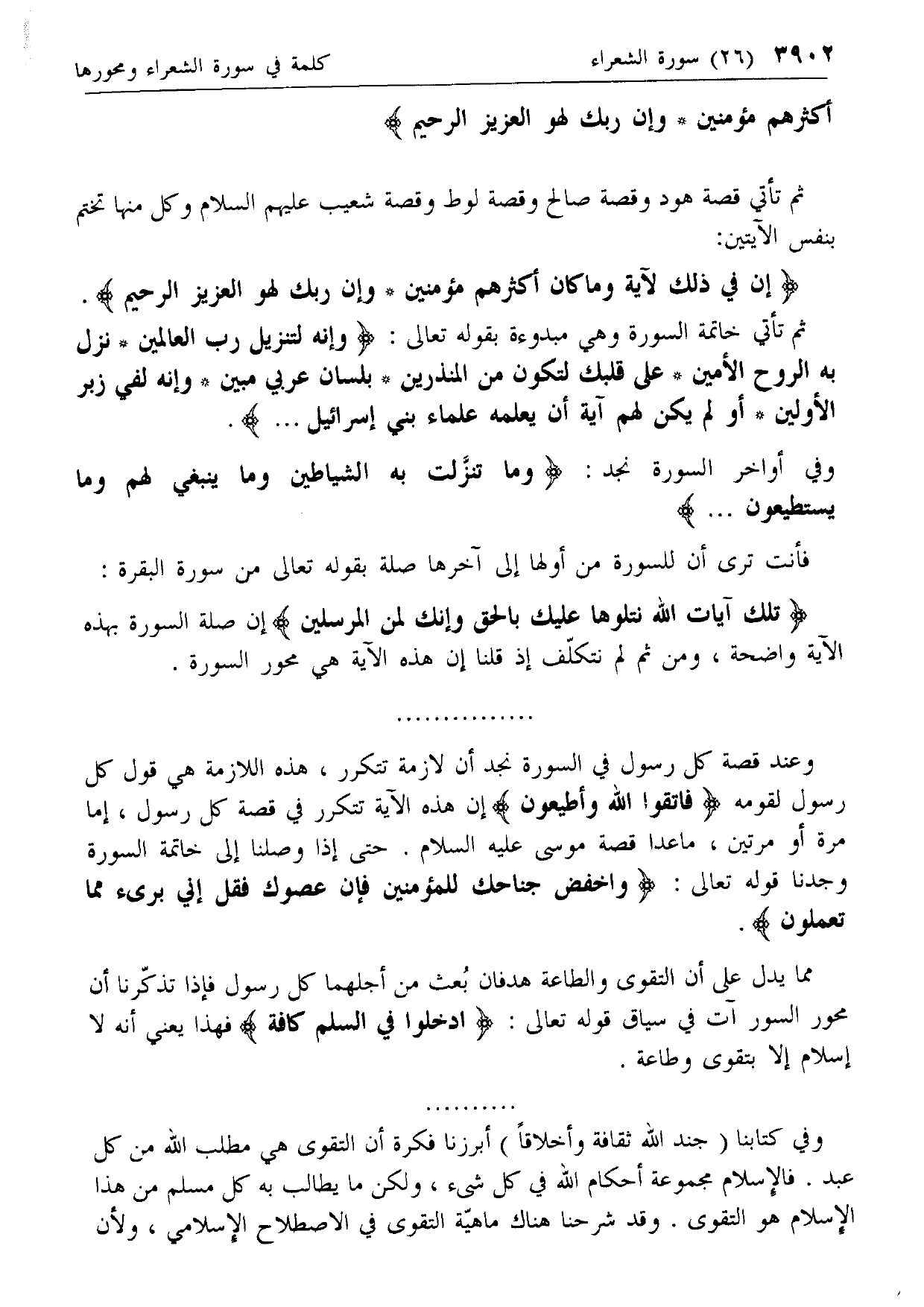 وعند قصة كل رسول في السورة نجد أن لازمة تتكرر، هذه اللازمة هي قول كل رسول لقومه فَاتَّقُوا اللَّهَ وَأَطِيعُونِ إن هذه الآية تتكرر في قصة كل رسول، إما مرة أو مرتين، ما عدا قصة موسى عليه السلام. حتى إذا وصلنا إلى خاتمة السورة وجدنا قوله تعالى: وَاخْفِضْ جَناحَكَ لِمَنِ اتَّبَعَكَ مِنَ الْمُؤْمِنِينَ فَإِنْ عَصَوْكَ فَقُلْ إِنِّي بَرِيءٌ مِمَّا تَعْمَلُونَ.