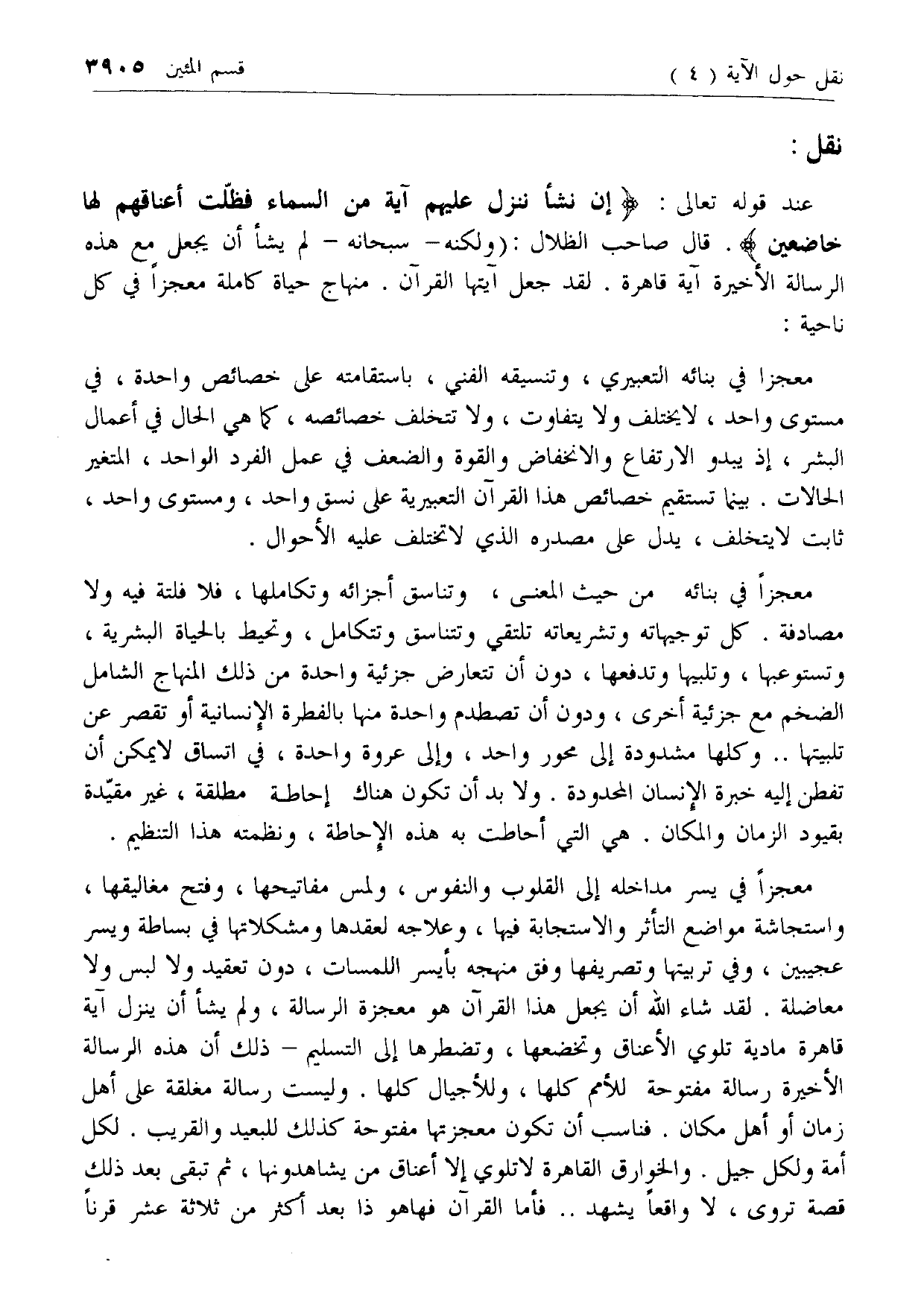 عند قوله تعالى: إِنْ نَشَأْ نُنَزِّلْ عَلَيْهِمْ مِنَ السَّماءِ آيَةً فَظَلَّتْ أَعْناقُهُمْ لَها خاضِعِينَ. قال صاحب الظلال: (ولكنه- سبحانه- لم يشأ أن يجعل مع هذه الرسالة الأخيرة آية قاهرة. لقد جعل آيتها القرآن. منهاج حياة كاملة معجزا في كل ناحية: