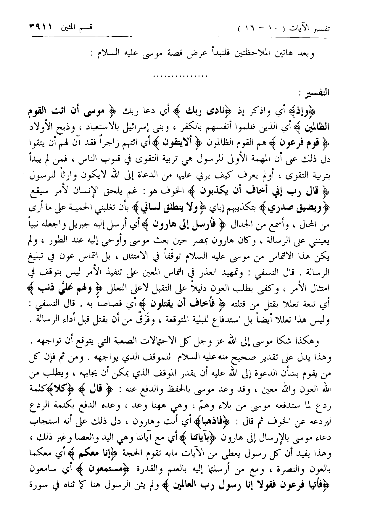 قَوْمَ فِرْعَوْنَ هم القوم الظالمون أَلا يَتَّقُونَ أي ائتهم زاجرا فقد آن لهم أن يتقوا دل ذلك على أن المهمة الأولى للرسول هي تربية التقوى في قلوب الناس، فمن لم يبدأ بتربية التقوى، أو لم يعرف كيف يربي عليها من الدعاة إلى الله لا يكون وارثا للرسول