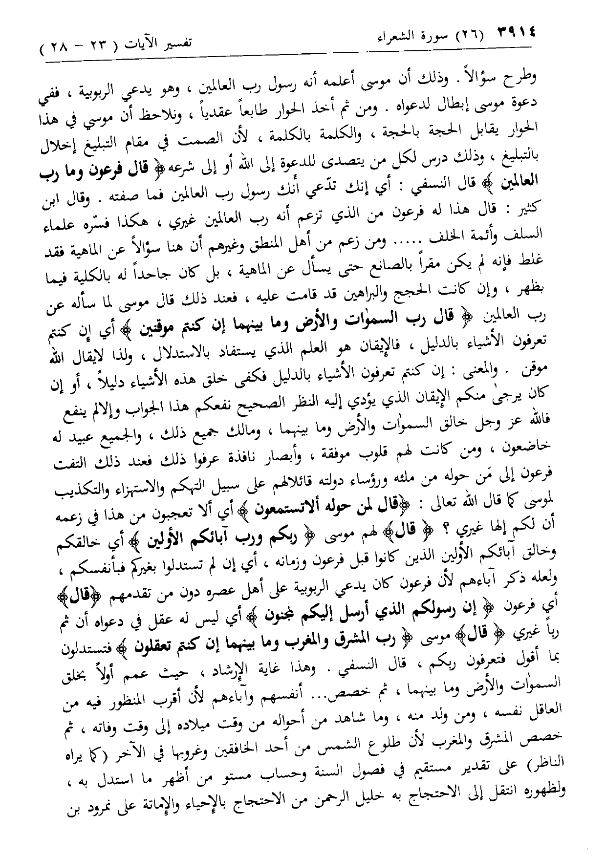 قالَ موسى رَبُّ الْمَشْرِقِ وَالْمَغْرِبِ وَما بَيْنَهُما إِنْ كُنْتُمْ تَعْقِلُونَ فتستدلون بما أقول فتعرفون ربكم، قال النسفي. وهذا غاية الإرشاد، حيث عمم أولا بخلق السموات والأرض وما بينهما، ثم خصص ... أنفسهم وآباءهم لأن أقرب المنظور فيه من العاقل نفسه، ومن ولد منه، وما شاهد من أحواله من وقت ميلاده إلى وقت وفاته، ثم خصص المشرق والمغرب لأن طلوع الشمس من أحد الخافقين وغروبها في الآخر (كما يراه الناظر) على تقدير مستقيم في فصول السنة وحساب مستو من أظهر ما استدل به، ولظهوره انتقل إلى الاحتجاج به خليل الرحمن من الاحتجاج بالإحياء والإماتة على نمرود بن