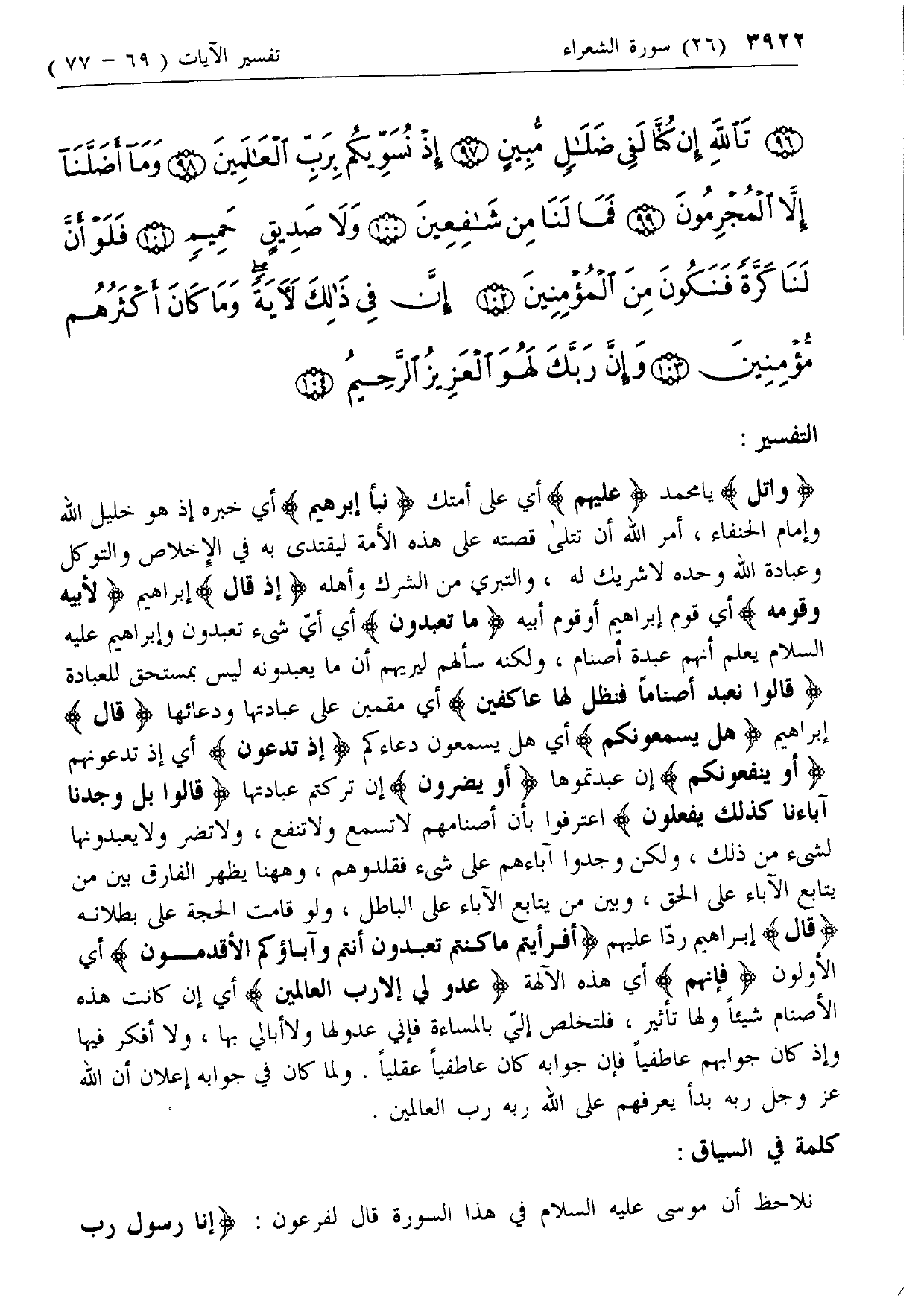 وَاتْلُ يا محمد عَلَيْهِمْ أي على أمتك نَبَأَ إِبْراهِيمَ أي خبره إذ هو خليل الله وإمام الحنفاء، أمر الله أن تتلى قصته على هذه الأمة ليقتدى به في الإخلاص والتوكل وعبادة الله وحده لا شريك له، والتبري من الشرك وأهله