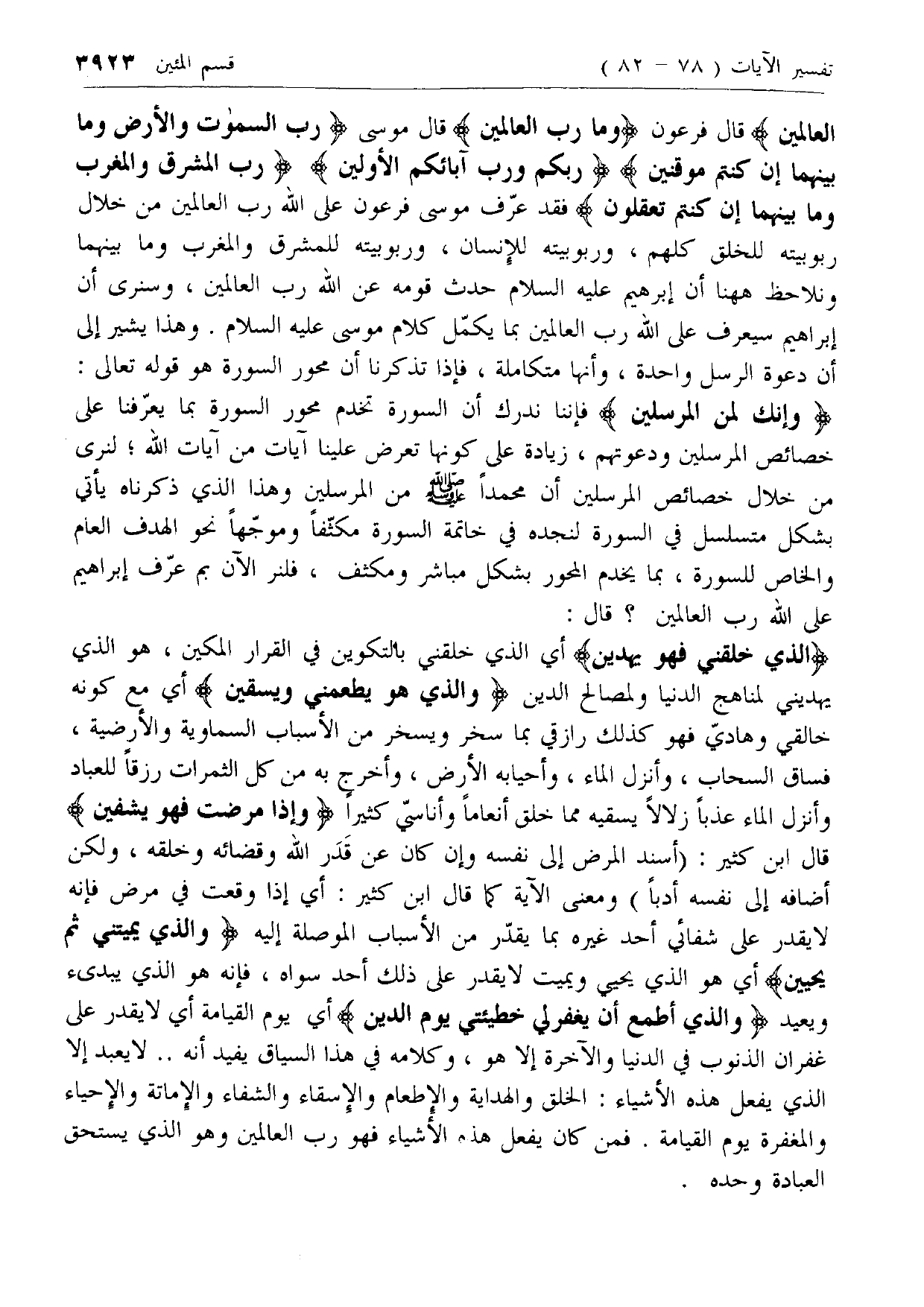الْعالَمِينَ قال فرعون وَما رَبُّ الْعالَمِينَ قال موسى رَبُّ السَّماواتِ وَالْأَرْضِ وَما بَيْنَهُمَا إِنْ كُنْتُمْ مُوقِنِينَ رَبُّكُمْ وَرَبُّ آبائِكُمُ الْأَوَّلِينَ رَبُّ الْمَشْرِقِ وَالْمَغْرِبِ وَما بَيْنَهُما إِنْ كُنْتُمْ تَعْقِلُونَ فقد عرف موسى فرعون على الله رب العالمين من خلال ربوبيته للخلق كلهم، وربوبيته للإنسان، وربوبيته للمشرق والمغرب وما بينهما ونلاحظ هاهنا أن إبراهيم عليه السلام حدث قومه عن الله رب العالمين، وسنرى أن إبراهيم سيعرف على الله رب العالمين بما يكمل كلام موسى عليه السلام. وهذا يشير إلى أن دعوة الرسل واحدة، وأنها متكاملة، فإذا تذكرنا أن محور السورة هو قوله تعالى: