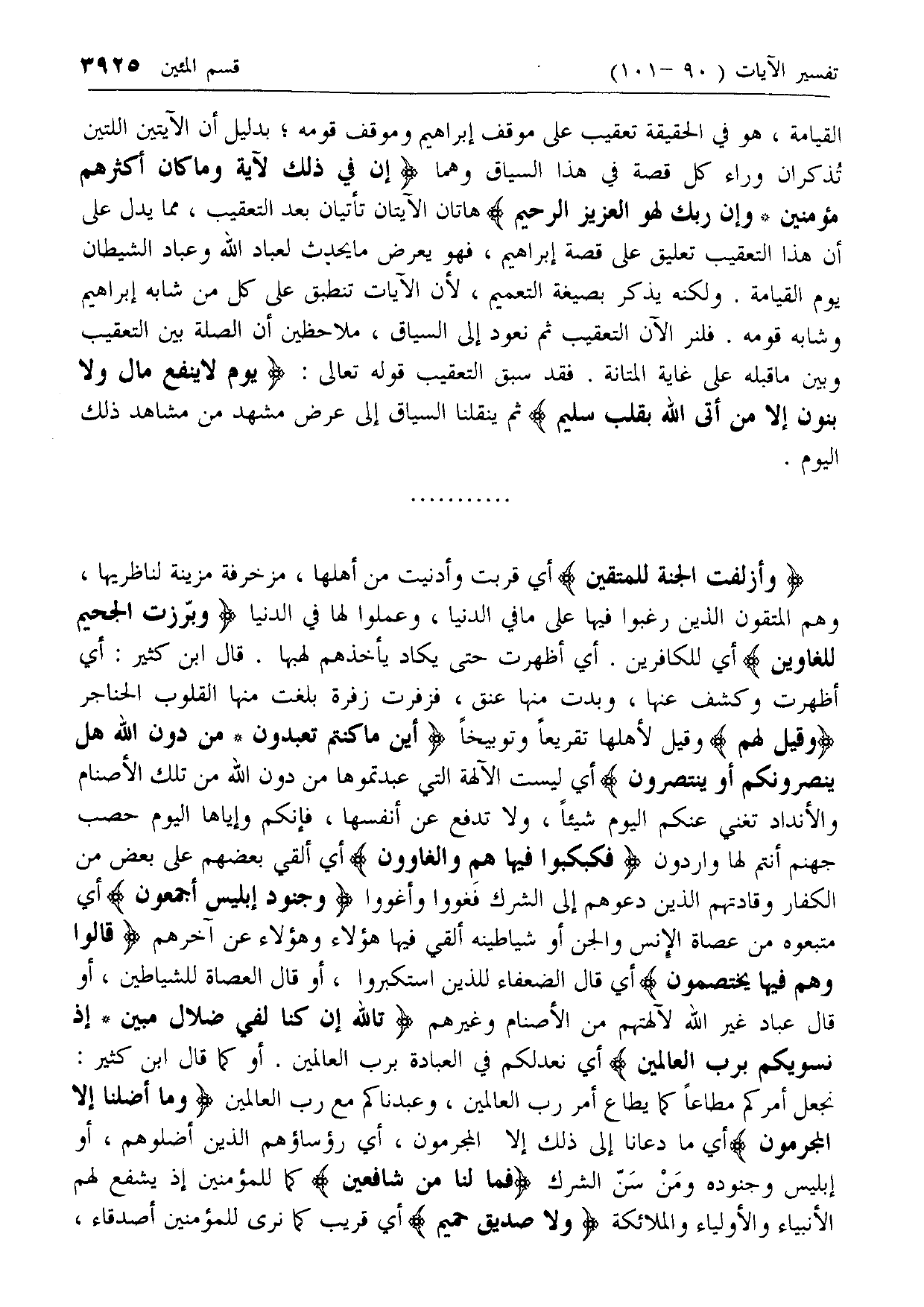 القيامة، هو في الحقيقة تعقيب على موقف إبراهيم وموقف قومه؛ بدليل أن الآيتين اللتين تذكران وراء كل قصة في هذا السياق وهما إِنَّ فِي ذلِكَ لَآيَةً وَما كانَ أَكْثَرُهُمْ مُؤْمِنِينَ* وَإِنَّ رَبَّكَ لَهُوَ الْعَزِيزُ الرَّحِيمُ هاتان الآيتان تأتيان بعد التعقيب، مما يدل على أن هذا التعقيب تعليق على قصة إبراهيم، فهو يعرض ما يحدث لعباد الله وعباد الشيطان يوم القيامة. ولكنه يذكر بصيغة التعميم، لأن الآيات تنطبق على كل من شابه إبراهيم وشابه قومه. فلنر الآن التعقيب ثم نعود إلى السياق، ملاحظين أن الصلة بين التعقيب وبين ما قبله على غاية المتانة. فقد سبق التعقيب قوله تعالى: يَوْمَ لا يَنْفَعُ مالٌ وَلا بَنُونَ إِلَّا مَنْ أَتَى اللَّهَ بِقَلْبٍ سَلِيمٍ ثم ينقلنا السياق إلى عرض مشهد من مشاهد ذلك اليوم.