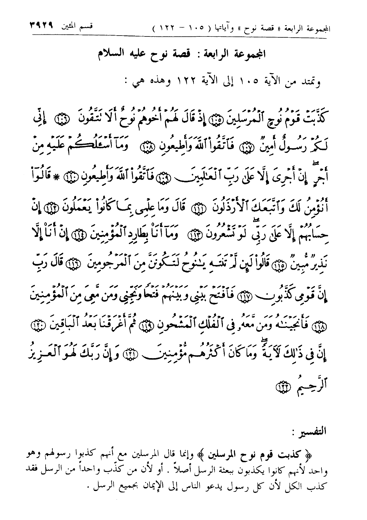 كَذَّبَتْ قَوْمُ نُوحٍ الْمُرْسَلِينَ (105) إِذْ قالَ لَهُمْ أَخُوهُمْ نُوحٌ أَلا تَتَّقُونَ (106) إِنِّي لَكُمْ رَسُولٌ أَمِينٌ (107) فَاتَّقُوا اللَّهَ وَأَطِيعُونِ (108) وَما أَسْئَلُكُمْ عَلَيْهِ مِنْ أَجْرٍ إِنْ أَجْرِيَ إِلاَّ عَلى رَبِّ الْعالَمِينَ (109)