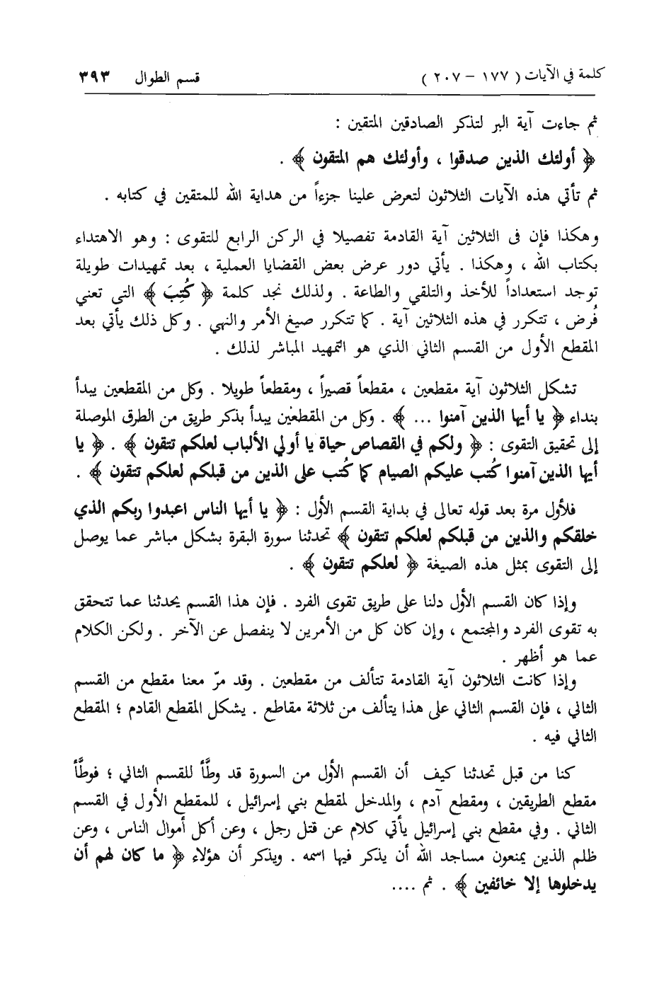 وهكذا فإن فى الثلاثين آية القادمة تفصيلا في الركن الرابع للتقوى: وهو الاهتداء بكتاب الله، وهكذا. يأتي دور عرض بعض القضايا العملية، بعد تمهيدات طويلة توجد استعدادا للأخذ والتلقي والطاعة. ولذلك نجد كلمة كُتِبَ التى تعني فرض، تتكرر في هذه الثلاثين آية. كما تتكرر صيغ الأمر والنهي. وكل ذلك يأتي بعد المقطع الأول من القسم الثاني الذي هو التمهيد المباشر لذلك.