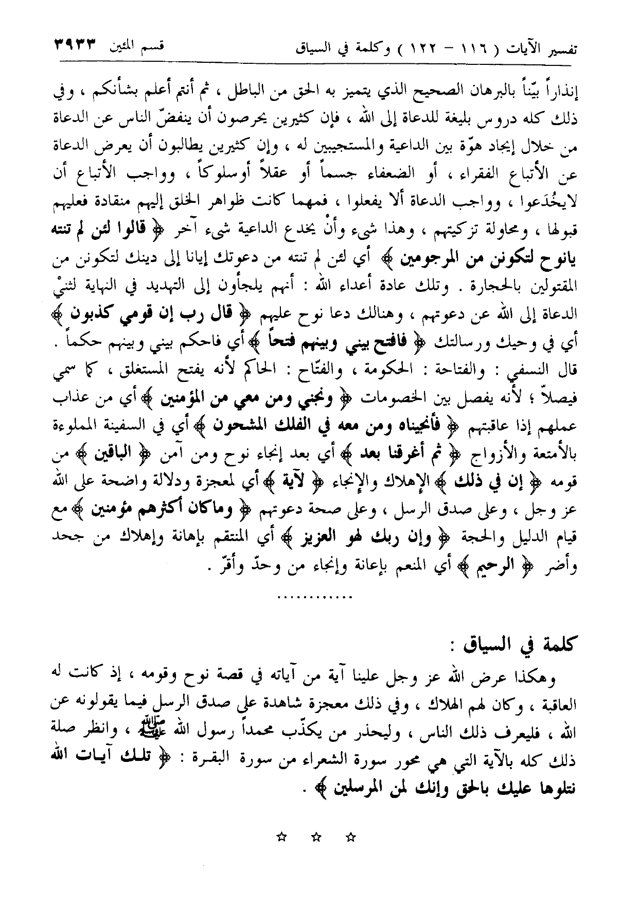 وهكذا عرض الله عزّ وجل علينا آية من آياته في قصة نوح وقومه، إذ كانت له العاقبة، وكان لهم الهلاك، وفي ذلك معجزة شاهدة على صدق الرسل فيما يقولونه عن الله، فليعرف ذلك الناس، وليحذر من يكذب محمدا رسول الله صلى الله عليه وسلم، وانظر صلة ذلك كله بالآية التي هي محور سورة الشعراء من سورة البقرة: تِلْكَ آياتُ اللَّهِ نَتْلُوها عَلَيْكَ بِالْحَقِّ وَإِنَّكَ لَمِنَ الْمُرْسَلِينَ.