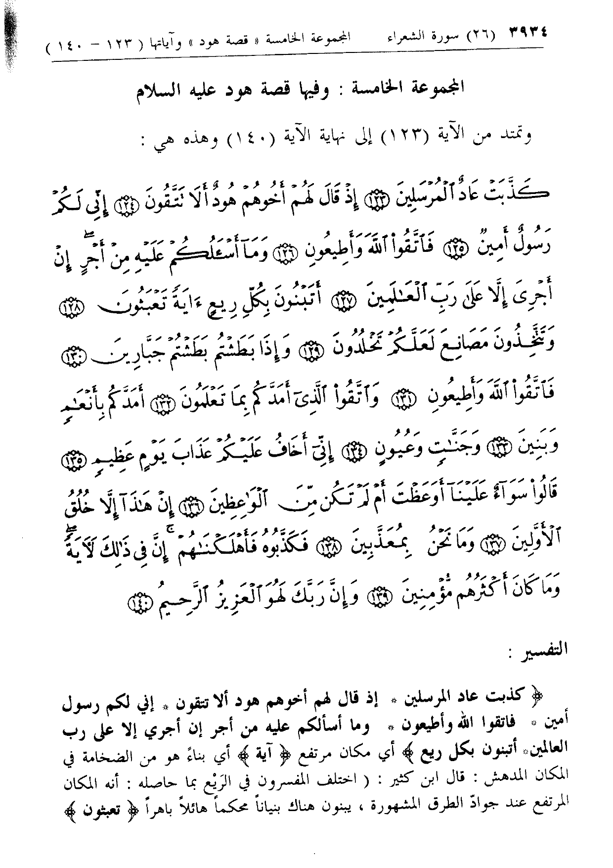كَذَّبَتْ عادٌ الْمُرْسَلِينَ* إِذْ قالَ لَهُمْ أَخُوهُمْ هُودٌ أَلا تَتَّقُونَ* إِنِّي لَكُمْ رَسُولٌ أَمِينٌ* فَاتَّقُوا اللَّهَ وَأَطِيعُونِ* وَما أَسْئَلُكُمْ عَلَيْهِ مِنْ أَجْرٍ إِنْ أَجْرِيَ إِلَّا عَلى رَبِّ الْعالَمِينَ* أَتَبْنُونَ بِكُلِّ رِيعٍ أي مكان مرتفع آيَةً أي بناء هو من الضخامة في المكان المدهش: قال ابن كثير: (اختلف المفسرون في الريع بما حاصله: أنه المكان المرتفع عند جواد الطرق المشهورة، يبنون هناك بنيانا محكما هائلا باهرا تَعْبَثُونَ