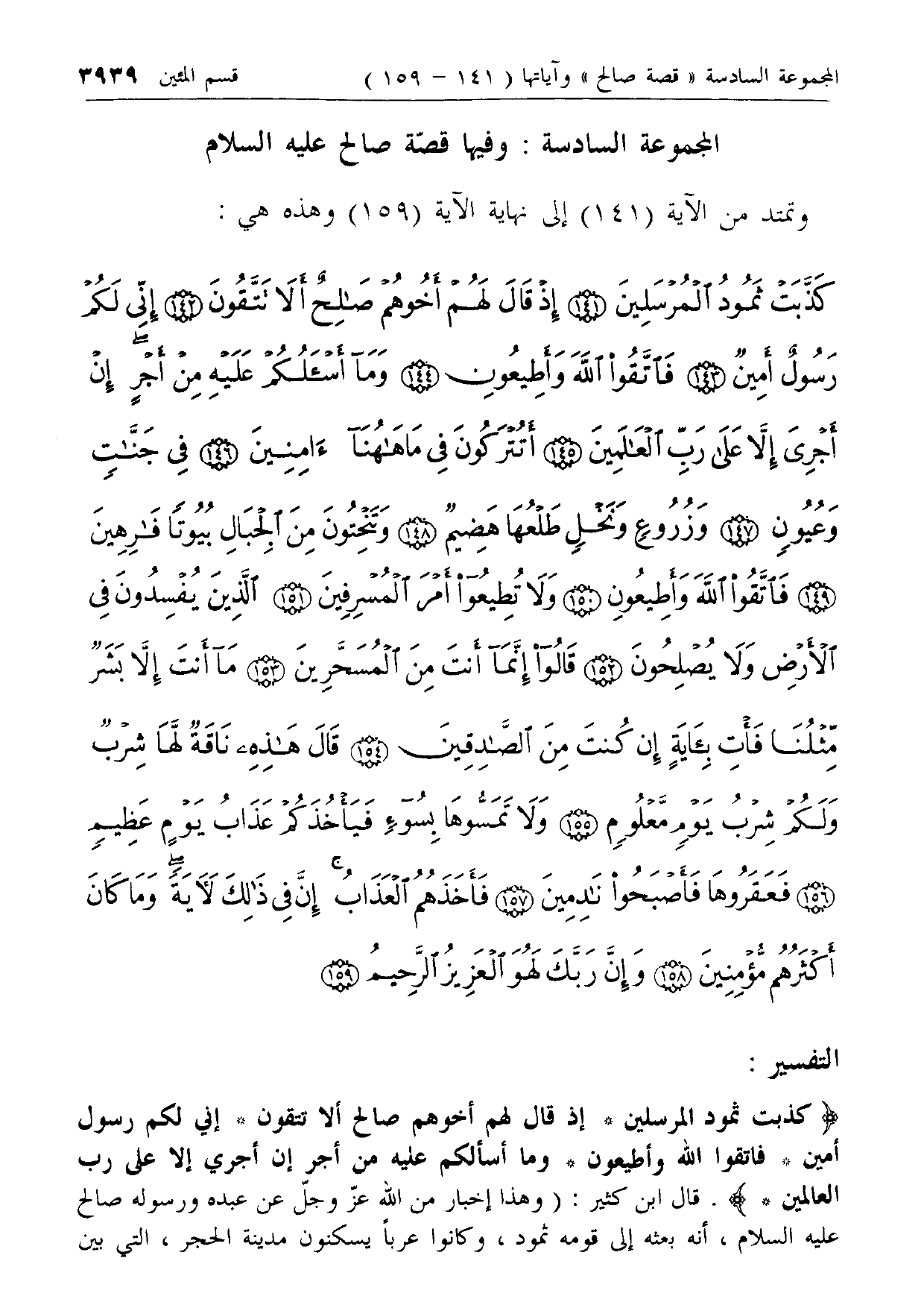 كَذَّبَتْ ثَمُودُ الْمُرْسَلِينَ (141) إِذْ قالَ لَهُمْ أَخُوهُمْ صالِحٌ أَلا تَتَّقُونَ (142) إِنِّي لَكُمْ رَسُولٌ أَمِينٌ (143) فَاتَّقُوا اللَّهَ وَأَطِيعُونِ (144) وَما أَسْئَلُكُمْ عَلَيْهِ مِنْ أَجْرٍ إِنْ أَجْرِيَ إِلاَّ عَلى رَبِّ الْعالَمِينَ (145)