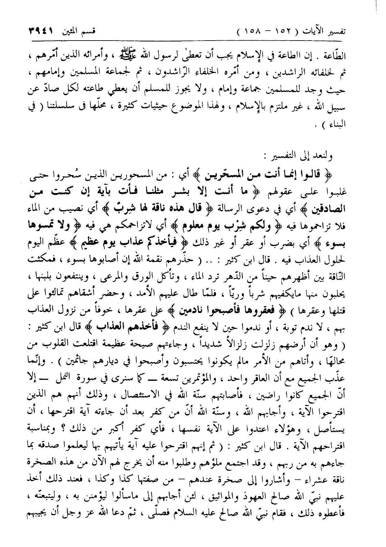 (وهو أن أرضهم زلزلت زلزالا شديدا، وجاءتهم صيحة عظيمة اقتلعت القلوب من محالها، وأتاهم من الأمر ما لم يكونوا يحتسبون وأصبحوا في ديارهم جاثمين). وإنما عذب الجميع مع أن العاقر واحد، والمؤتمرين تسعة- كما سنرى في سورة النمل- إلا أن الجميع كانوا راضين، فأصابتهم سنة الله في الاستئصال، وذلك أنهم هم الذين اقترحوا الآية، وأجابهم الله، وسنة الله أن من كفر بعد أن جاءته آية اقترحها، أن يستأصل، وهؤلاء اعتدوا على الآية نفسها، فأي كفر أكبر من ذلك؟ وبمناسبة اقتراحهم الآية. قال ابن كثير: (ثم إنهم اقترحوا عليه آية يأتيهم بها ليعلموا صدقة بما جاءهم به من ربهم، وقد اجتمع ملؤهم وطلبوا منه أن يخرج لهم الآن من هذه الصخرة ناقة عشراء- وأشاروا إلى صخرة عندهم- من صفتها كذا وكذا، فعند ذلك أخذ عليهم نبي الله صالح العهود والمواثيق، لئن أجابهم إلى ما سألوا ليؤمنن به، وليتبعنه، فأعطوه ذلك، فقام نبي الله صالح عليه السلام فصلى، ثم دعا الله عزّ وجل أن يجيبهم