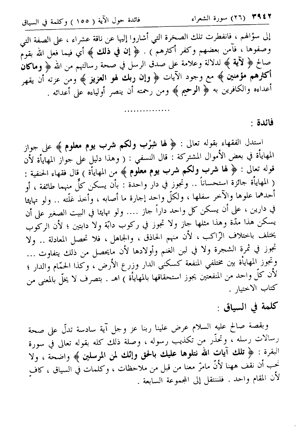 إلى سؤالهم، فانفطرت تلك الصخرة التي أشاروا إليها عن ناقة عشراء، على الصفة التي وصفوها، فآمن بعضهم وكفر أكثرهم). إِنَّ فِي ذلِكَ أي فيما فعل الله بقوم صالح لَآيَةً لدلالة وعلامة على صدق الرسل في صحة رسالتهم من الله وَما كانَ أَكْثَرُهُمْ مُؤْمِنِينَ مع وجود الآيات