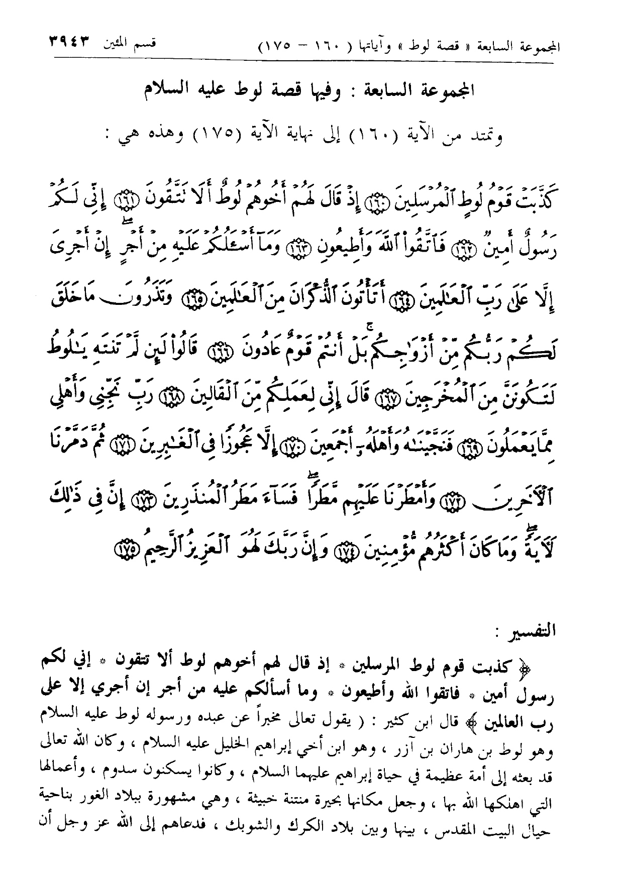 كَذَّبَتْ قَوْمُ لُوطٍ الْمُرْسَلِينَ* إِذْ قالَ لَهُمْ أَخُوهُمْ لُوطٌ أَلا تَتَّقُونَ* إِنِّي لَكُمْ رَسُولٌ أَمِينٌ* فَاتَّقُوا اللَّهَ وَأَطِيعُونِ* وَما أَسْئَلُكُمْ عَلَيْهِ مِنْ أَجْرٍ إِنْ أَجْرِيَ إِلَّا عَلى رَبِّ الْعالَمِينَ قال ابن كثير: (يقول تعالى مخبرا عن عبده ورسوله لوط عليه السلام وهو لوط بن هاران بن آزر، وهو ابن أخي إبراهيم الخليل عليه السلام، وكان الله تعالى قد بعثه إلى أمة عظيمة في حياة إبراهيم عليهما السلام، وكانوا يسكنون سدوم، وأعمالها التي اهلكها الله بها، وجعل مكانها بحيرة منتنة خبيثة، وهي مشهورة ببلاد الغور بناحية حيال البيت المقدس، بينها وبين بلاد الكرك والشوبك، فدعاهم إلى الله عزّ وجل أن