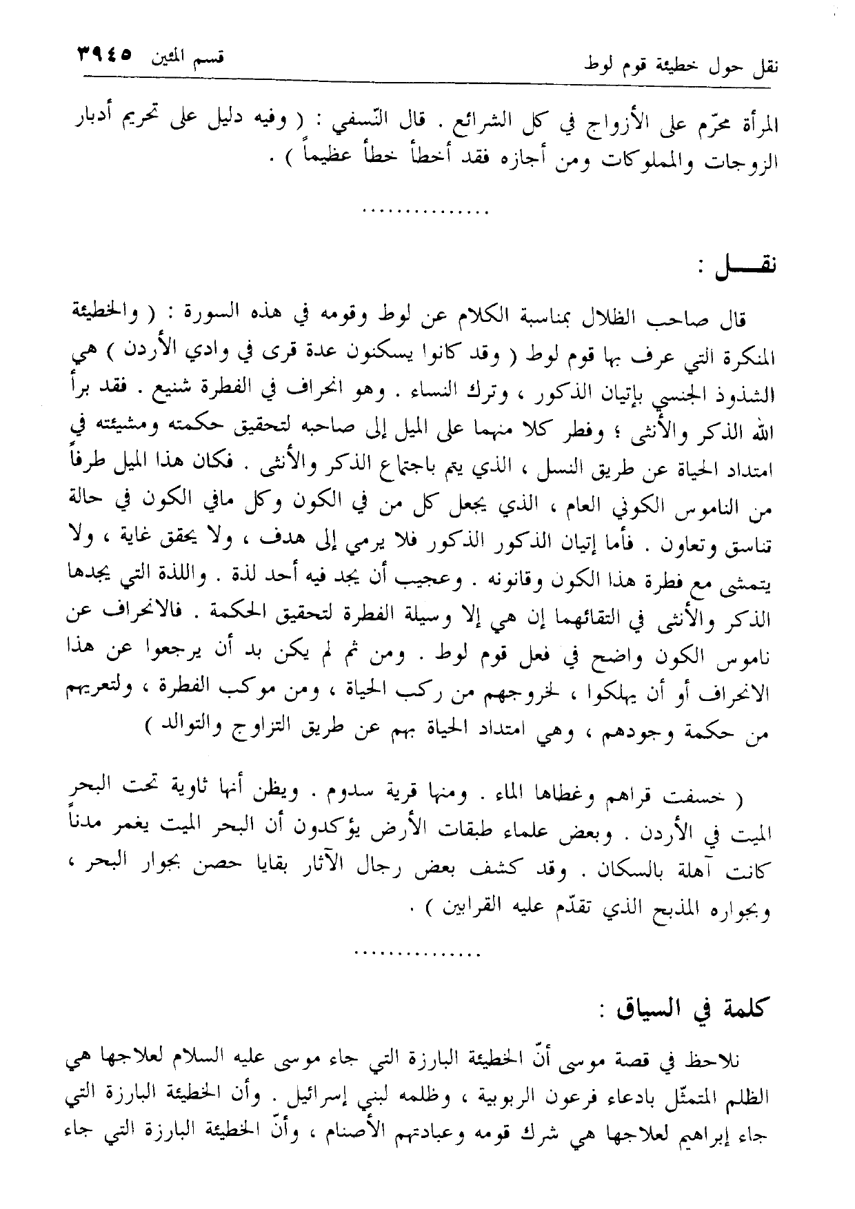 قال صاحب الظلال بمناسبة الكلام عن لوط وقومه في هذه السورة: (والخطيئة المنكرة التي عرف بها قوم لوط (وقد كانوا يسكنون عدة قرى في وادي الأردن) هي الشذوذ الجنسي بإتيان الذكور، وترك النساء. وهو انحراف في الفطرة شنيع. فقد برأ الله الذكر والأنثى؛ وفطر كلا منهما على الميل إلى صاحبه لتحقيق حكمته ومشيئته في امتداد الحياة عن طريق النسل، الذي يتم باجتماع الذكر والأنثى. فكان هذا الميل طرفا من الناموس الكوني العام، الذي يجعل كل من في الكون وكل ما في الكون في حالة تناسق وتعاون. فأما إتيان الذكور الذكور فلا يرمي إلى هدف، ولا يحقق غاية، ولا يتمشى مع فطرة هذا الكون وقانونه. وعجيب أن يجد فيه أحد لذة. واللذة التي يجدها الذكر والأنثى في التقائهما إن هي إلا وسيلة الفطرة لتحقيق الحكمة. فالانحراف عن ناموس الكون واضح في فعل قوم لوط. ومن ثم لم يكن بد أن يرجعوا عن هذا الانحراف أو أن يهلكوا، لخروجهم من ركب الحياة، ومن موكب الفطرة، ولتعريهم من حكمة وجودهم، وهي امتداد الحياة بهم عن طريق التزاوج والتوالد)