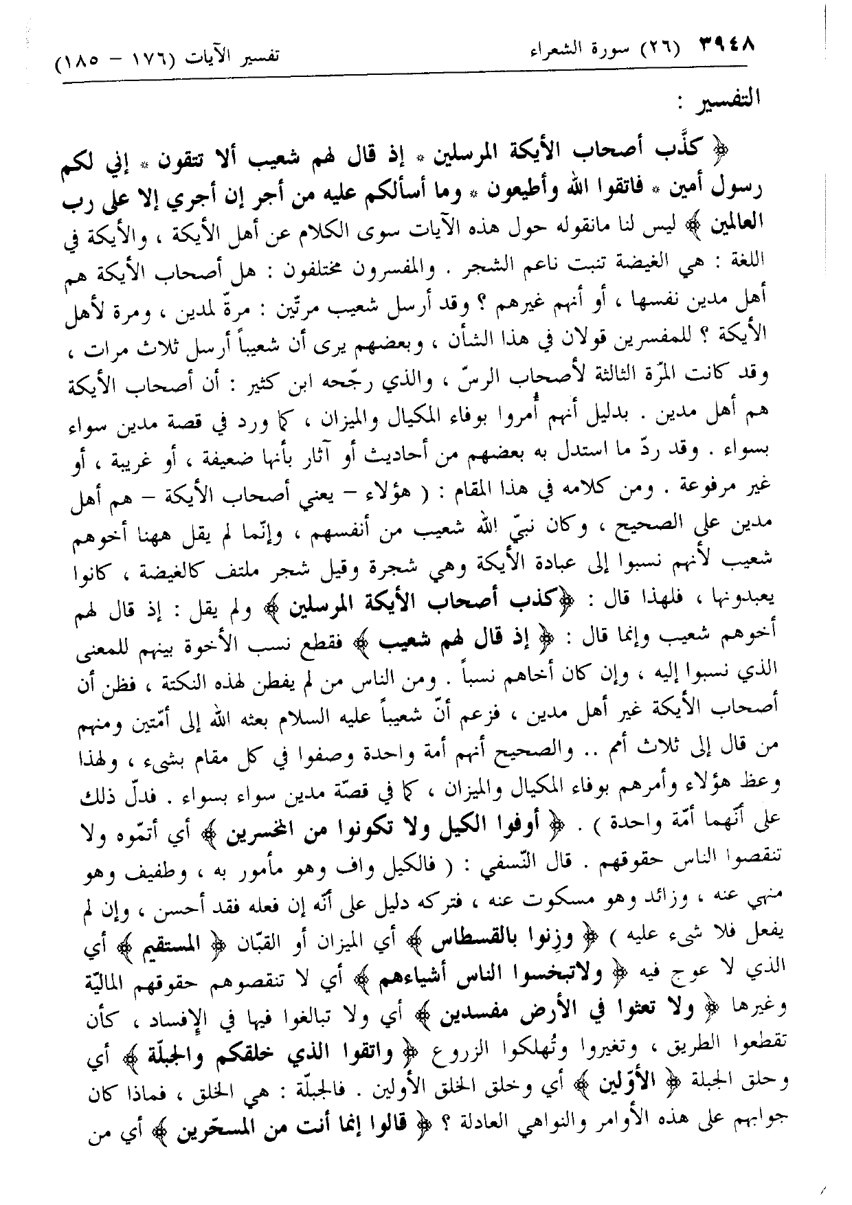 كَذَّبَ أَصْحابُ الْأَيْكَةِ الْمُرْسَلِينَ* إِذْ قالَ لَهُمْ شُعَيْبٌ أَلا تَتَّقُونَ* إِنِّي لَكُمْ رَسُولٌ أَمِينٌ* فَاتَّقُوا اللَّهَ وَأَطِيعُونِ* وَما أَسْئَلُكُمْ عَلَيْهِ مِنْ أَجْرٍ إِنْ أَجْرِيَ إِلَّا عَلى رَبِّ الْعالَمِينَ ليس لنا ما نقوله حول هذه الآيات سوى الكلام عن أهل الأيكة، والأيكة في اللغة: هي الغيضة تنبت ناعم الشجر. والمفسرون مختلفون: هل أصحاب الأيكة هم أهل مدين نفسها، أو أنهم غيرهم؟ وقد أرسل شعيب مرتين: مرة لمدين، ومرة لأهل الأيكة؟ للمفسرين قولان في هذا الشأن، وبعضهم يرى أن شعيبا أرسل ثلاث مرات، وقد كانت المرة الثالثة لأصحاب الرس، والذي رجحه ابن كثير: أن أصحاب الأيكة هم أهل مدين. بدليل أنهم أمروا بوفاء المكيال والميزان، كما ورد في قصة مدين سواء بسواء. وقد رد ما استدل به بعضهم من أحاديث أو آثار بأنها ضعيفة، أو غريبة، أو غير مرفوعة. ومن كلامه في هذا المقام: (هؤلاء- يعني أصحاب الأيكة- هم أهل مدين على الصحيح، وكان نبي الله شعيب من أنفسهم، وإنما لم يقل هاهنا أخوهم شعيب لأنهم نسبوا إلى عبادة الأيكة وهي شجرة وقيل شجر ملتف كالغيضة، كانوا يعبدونها، فلهذا قال: كَذَّبَ أَصْحابُ الْأَيْكَةِ الْمُرْسَلِينَ ولم يقل: إذ قال لهم أخوهم شعيب وإنما قال: إِذْ قالَ لَهُمْ شُعَيْبٌ فقطع نسب الأخوة بينهم للمعنى الذي نسبوا إليه، وإن كان أخاهم نسبا. ومن الناس من لم يفطن لهذه النكتة، فظن أن أصحاب الأيكة غير أهل مدين، فزعم أن شعيبا عليه السلام بعثه الله إلى أمتين ومنهم من قال إلى ثلاث أمم .. والصحيح أنهم أمة واحدة وصفوا في كل مقام بشيء، ولهذا وعظ هؤلاء وأمرهم بوفاء المكيال والميزان، كما في قصة مدين سواء بسواء. فدل ذلك على أنهما أمة واحدة).