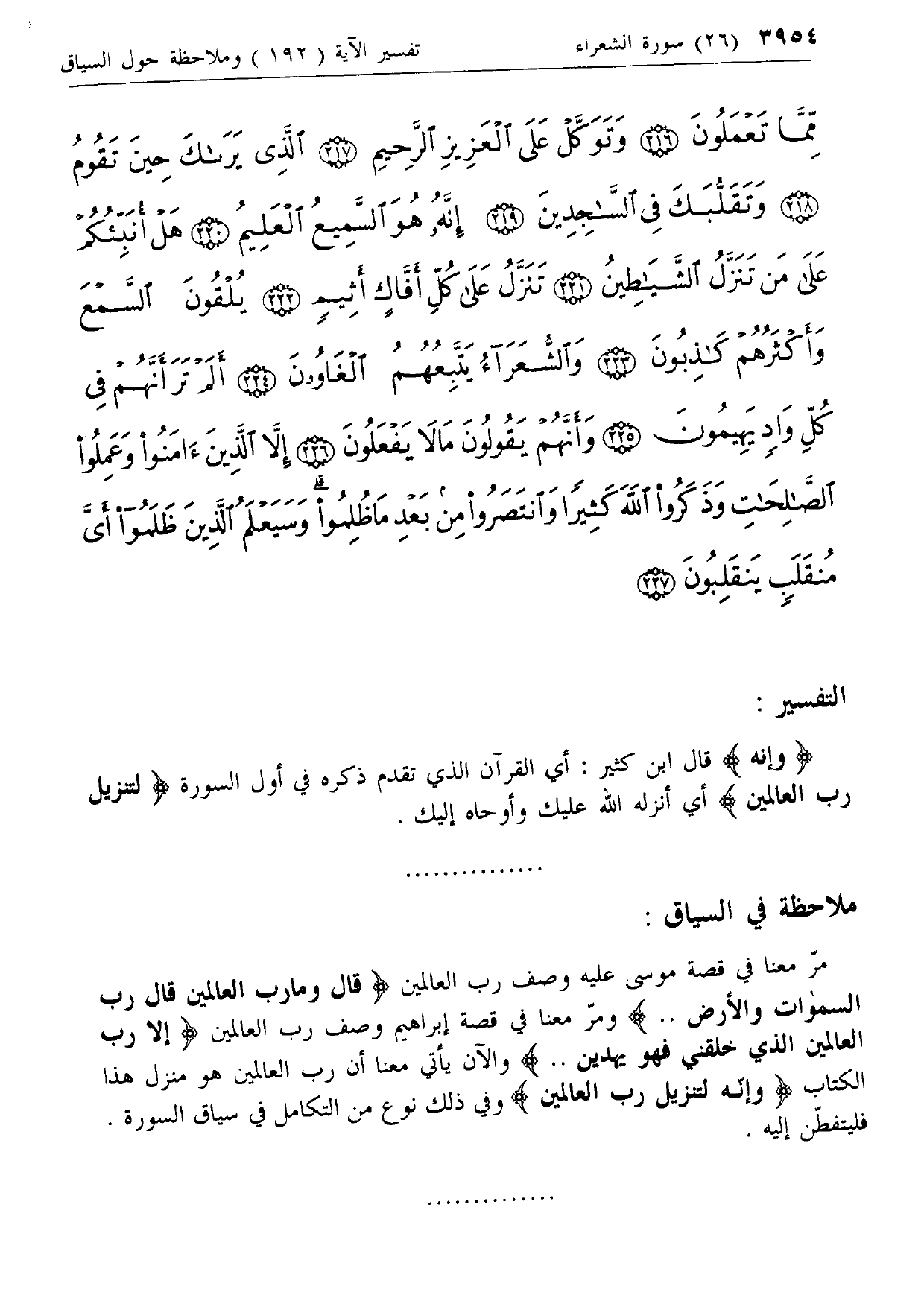 مر معنا في قصة موسى عليه وصف رب العالمين قالَ فِرْعَوْنُ وَما رَبُّ الْعالَمِينَ قالَ رَبُّ السَّماواتِ وَالْأَرْضِ .. ومر معنا في قصة إبراهيم وصف رب العالمين إِلَّا رَبَّ الْعالَمِينَ الَّذِي خَلَقَنِي فَهُوَ يَهْدِينِ .. والآن يأتي معنا أن رب العالمين هو منزل هذا الكتاب وَإِنَّهُ لَتَنْزِيلُ رَبِّ الْعالَمِينَ وفي ذلك نوع من التكامل في سياق السورة.