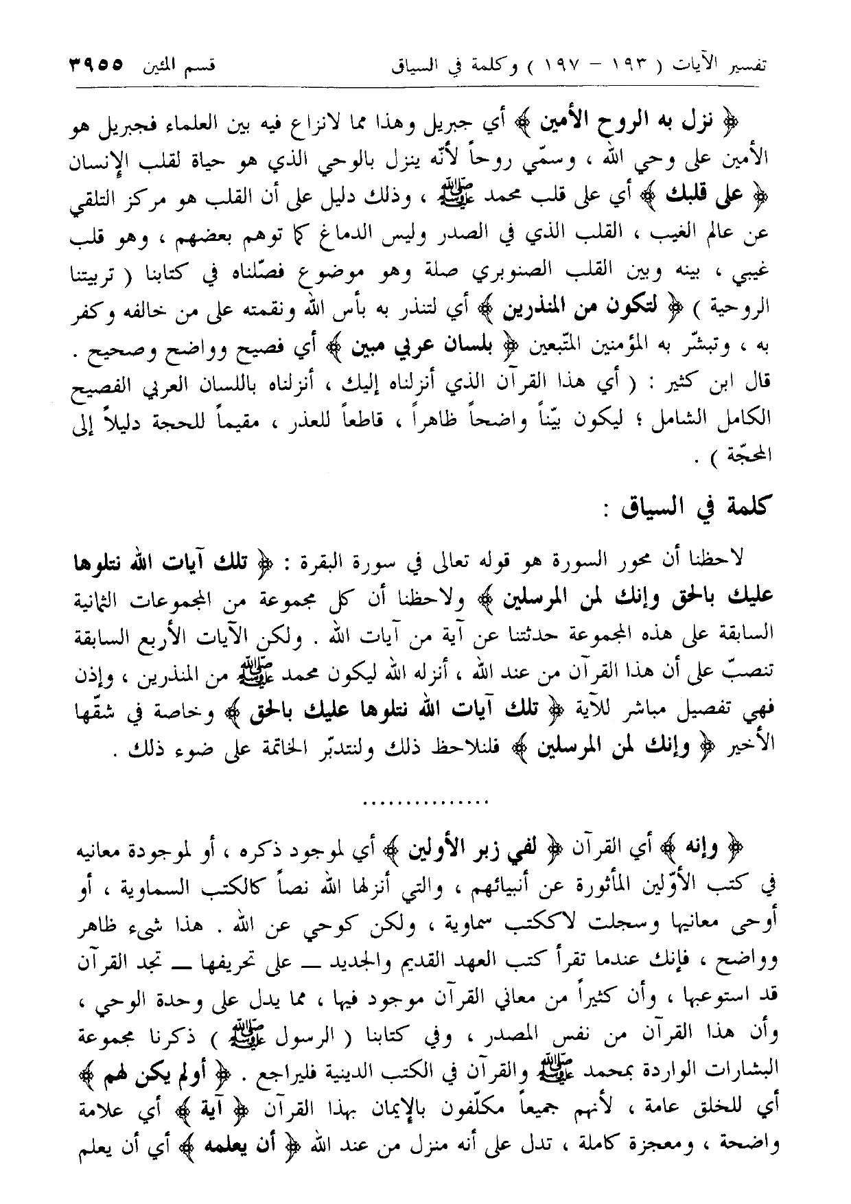 لاحظنا أن محور السورة هو قوله تعالى في سورة البقرة: تِلْكَ آياتُ اللَّهِ نَتْلُوها عَلَيْكَ بِالْحَقِّ وَإِنَّكَ لَمِنَ الْمُرْسَلِينَ ولاحظنا أن كل مجموعة من المجموعات الثمانية السابقة على هذه المجموعة حدثتنا عن آية من آيات الله. ولكن الآيات الأربع السابقة تنصب على أن هذا القرآن من عند الله، أنزله الله ليكون محمد صلى الله عليه وسلم من المنذرين، وإذن فهي تفصيل مباشر للآية تِلْكَ آياتُ اللَّهِ نَتْلُوها عَلَيْكَ بِالْحَقِّ وخاصة في شقها الأخير وَإِنَّكَ لَمِنَ الْمُرْسَلِينَ فلنلاحظ ذلك ولنتدبر الخاتمة على ضوء ذلك.