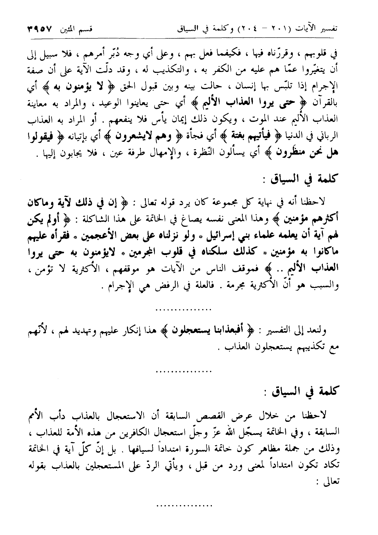 لاحظنا أنه في نهاية كل مجموعة كان يرد قوله تعالى: إِنَّ فِي ذلِكَ لَآيَةً وَما كانَ أَكْثَرُهُمْ مُؤْمِنِينَ* وهذا المعنى نفسه يصاغ في الخاتمة على هذا الشاكلة: أَوَلَمْ يَكُنْ لَهُمْ آيَةً أَنْ يَعْلَمَهُ عُلَماءُ بَنِي إِسْرائِيلَ* وَلَوْ نَزَّلْناهُ عَلى بَعْضِ الْأَعْجَمِينَ* فَقَرَأَهُ عَلَيْهِمْ ما كانُوا بِهِ مُؤْمِنِينَ* كَذلِكَ سَلَكْناهُ فِي قُلُوبِ الْمُجْرِمِينَ* لا يُؤْمِنُونَ بِهِ حَتَّى يَرَوُا الْعَذابَ الْأَلِيمَ .. فموقف الناس من الآيات هو موقفهم، الأكثرية لا تؤمن، والسبب هو أن الأكثرية مجرمة. فالعلة في الرفض هي الإجرام.