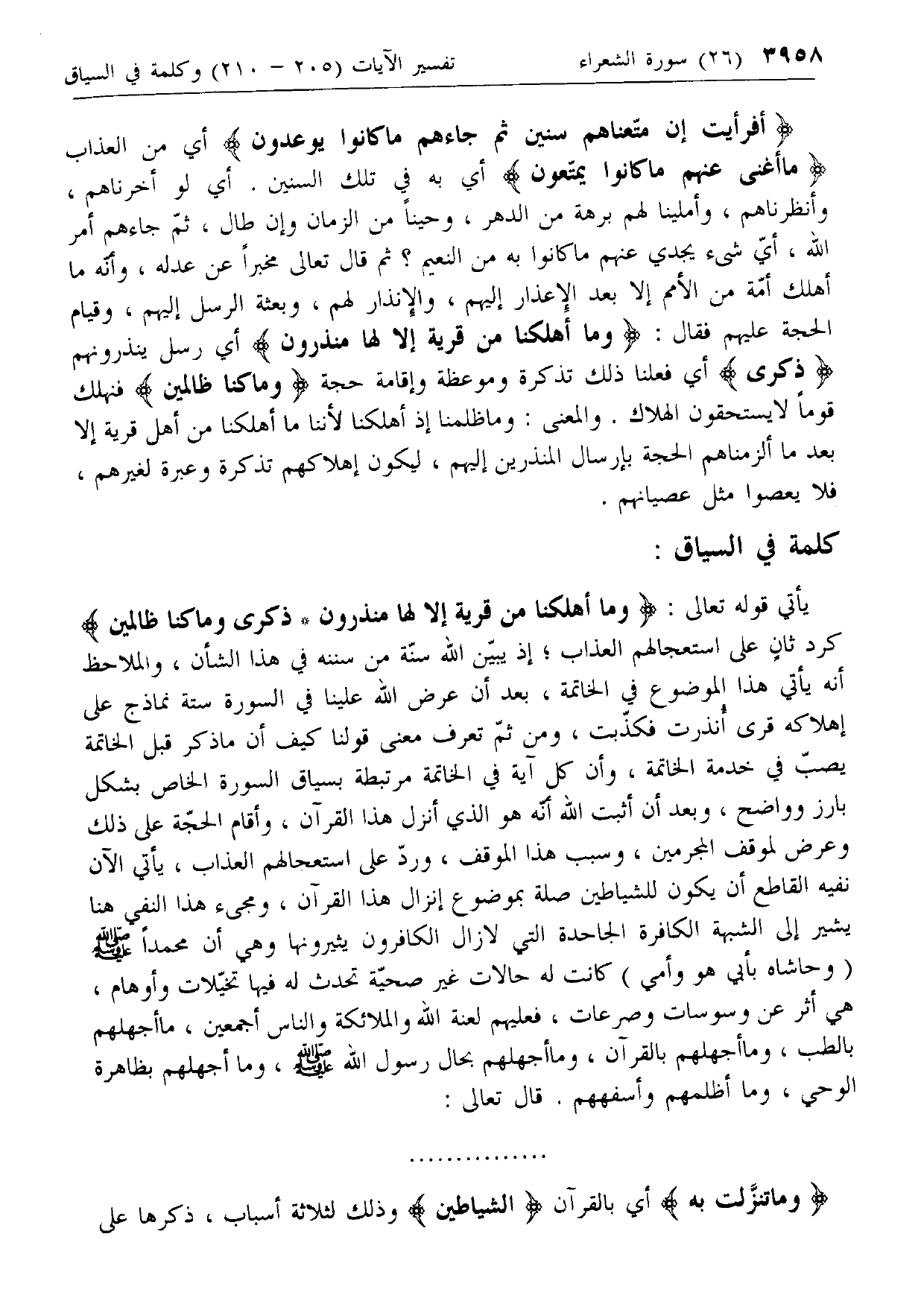 يأتي قوله تعالى: وَما أَهْلَكْنا مِنْ قَرْيَةٍ إِلَّا لَها مُنْذِرُونَ* ذِكْرى وَما كُنَّا ظالِمِينَ كرد ثان على استعجالهم العذاب؛ إذ يبين الله سنة من سننه في هذا الشأن، والملاحظ أنه يأتي هذا الموضوع في الخاتمة، بعد أن عرض الله علينا في السورة ستة نماذج على إهلاكه قرى أنذرت فكذبت، ومن ثم تعرف معنى قولنا كيف أن ما ذكر قبل الخاتمة يصب في خدمة الخاتمة، وأن كل آية في الخاتمة مرتبطة بسياق السورة الخاص بشكل بارز وواضح، وبعد أن أثبت الله أنه هو الذي أنزل هذا القرآن، وأقام الحجة على ذلك وعرض لموقف المجرمين، وسبب هذا الموقف، ورد على استعجالهم العذاب، يأتي الآن نفيه القاطع أن يكون للشياطين صلة بموضوع إنزال هذا القرآن، ومجيء هذا النفي هنا يشير إلى الشبهة الكافرة الجاحدة التي لا زال الكافرون يثيرونها وهي أن محمدا صلى الله عليه وسلم (وحاشاه بأبي هو وأمي) كانت له حالات غير صحية تحدث له فيها تخيلات وأوهام، هي أثر عن وسوسات وصرعات، فعليهم لعنة الله والملائكة والناس أجمعين، ما أجهلهم بالطب، وما أجهلهم بالقرآن، وما أجهلهم بحال رسول الله صلى الله عليه وسلم، وما أجهلهم بظاهرة الوحي، وما أظلمهم وأسفههم. قال تعالى: