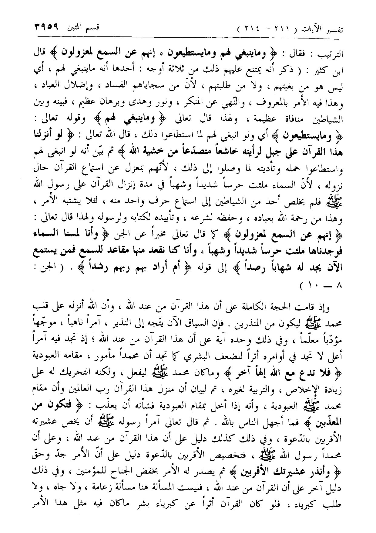 الترتيب: فقال: وَما يَنْبَغِي لَهُمْ وَما يَسْتَطِيعُونَ* إِنَّهُمْ عَنِ السَّمْعِ لَمَعْزُولُونَ قال ابن كثير: (ذكر أنه يمتنع عليهم ذلك من ثلاثة أوجه: أحدها أنه ما ينبغي لهم، أي ليس هو من بغيتهم، ولا من طلبتهم، لأن من سجاياهم الفساد، وإضلال العباد، وهذا فيه الأمر بالمعروف، والنهي عن المنكر، ونور وهدى وبرهان عظيم، فبينه وبين الشياطين منافاة عظيمة، ولهذا قال تعالى وَما يَنْبَغِي لَهُمْ وقوله تعالى: