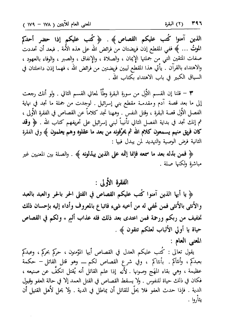 الَّذِينَ آمَنُوا كُتِبَ عَلَيْكُمُ الْقِصاصُ. كُتِبَ عَلَيْكُمْ إِذا حَضَرَ أَحَدَكُمُ الْمَوْتُ ... ففي المقطع إذن فريضتان من فرائض الله على هذه الأمة. فبعد أن تحددت صفات المتقين التي من جملتها الإيمان، والصلاة، والإنفاق، والصبر، والوفاء بالعهود، والاهتداء بالقرآن. يأتي هذا المقطع ليبين فريضتين من فرائض الله، فهما إذن داخلتان في السياق الكبير في باب الاهتداء بكتاب الله.