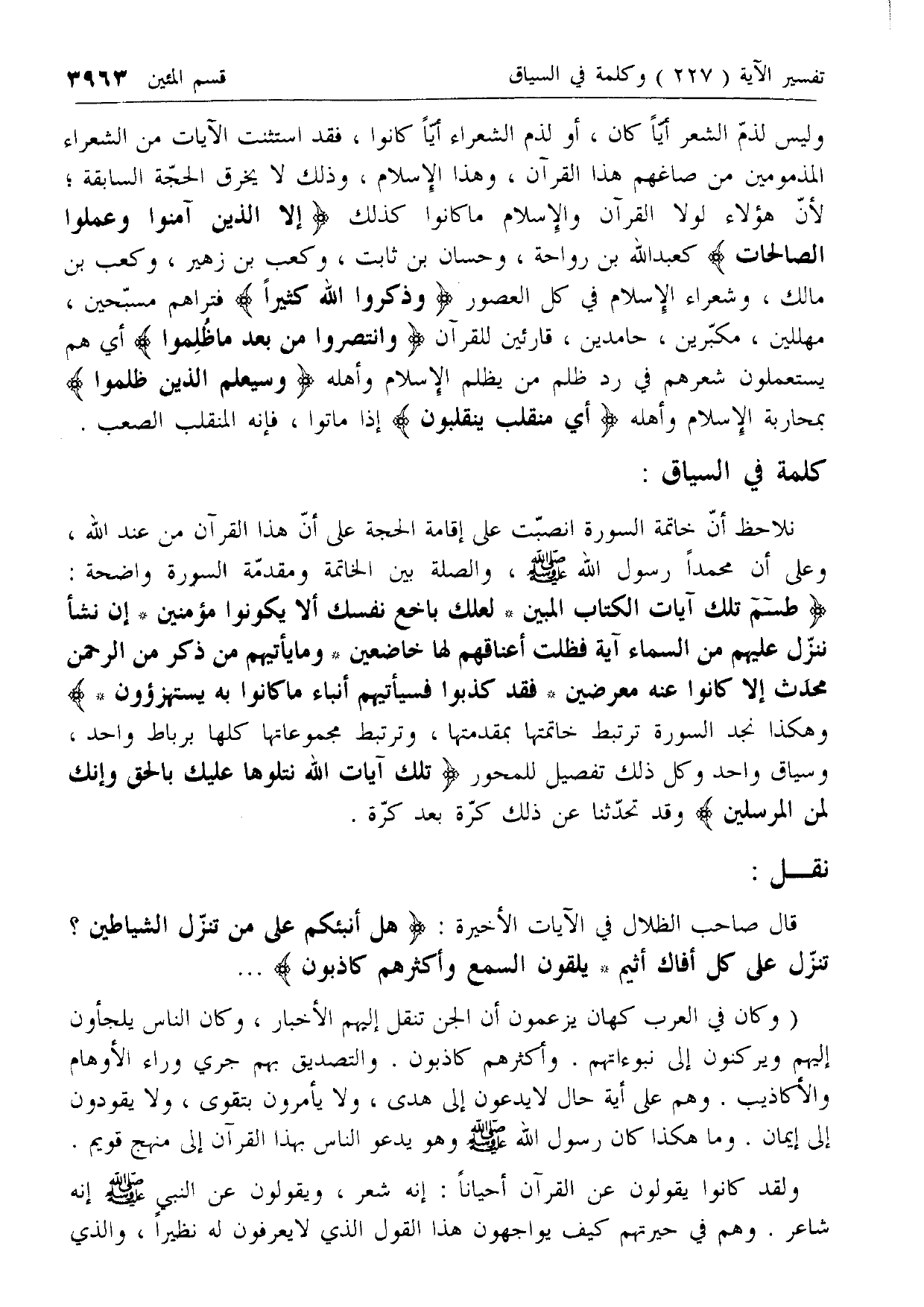إِلَّا الَّذِينَ آمَنُوا وَعَمِلُوا الصَّالِحاتِ كعبد الله بن رواحة، وحسان بن ثابت، وكعب بن زهير، وكعب بن مالك، وشعراء الإسلام في كل العصور وَذَكَرُوا اللَّهَ كَثِيراً فتراهم مسبحين، مهللين، مكبرين، حامدين، قارئين للقرآن وَانْتَصَرُوا مِنْ بَعْدِ ما ظُلِمُوا أي هم يستعملون شعرهم في رد ظلم من يظلم الإسلام وأهله وَسَيَعْلَمُ الَّذِينَ ظَلَمُوا بمحاربة الإسلام وأهله أَيَّ مُنْقَلَبٍ يَنْقَلِبُونَ إذا ماتوا، فإنه المنقلب الصعب.