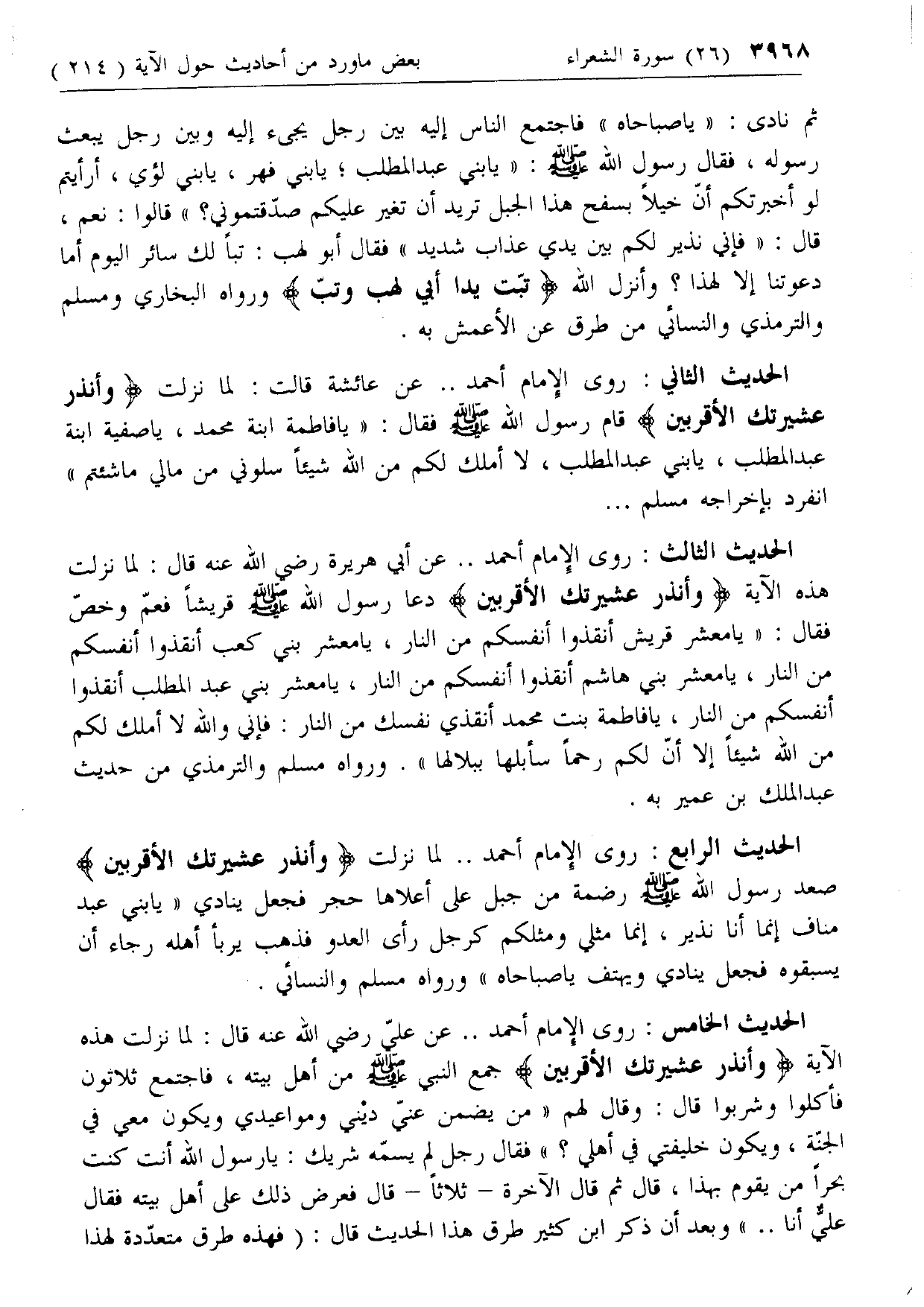 الحديث الثالث: روى الإمام أحمد .. عن أبي هريرة رضي الله عنه قال: لما نزلت هذه الآية وَأَنْذِرْ عَشِيرَتَكَ الْأَقْرَبِينَ دعا رسول الله صلى الله عليه وسلم قريشا فعم وخص فقال: «يا معشر قريش أنقذوا أنفسكم من النار، يا معشر بني كعب أنقذوا أنفسكم من النار، يا معشر بني هاشم أنقذوا أنفسكم من النار، يا معشر بني عبد المطلب أنقذوا أنفسكم من النار، يا فاطمة بنت محمد أنقذي نفسك من النار: فإني والله لا أملك لكم من الله شيئا إلا أن لكم رحما سأبلها ببلالها». ورواه مسلم والترمذي من حديث عبد الملك بن عمير به.