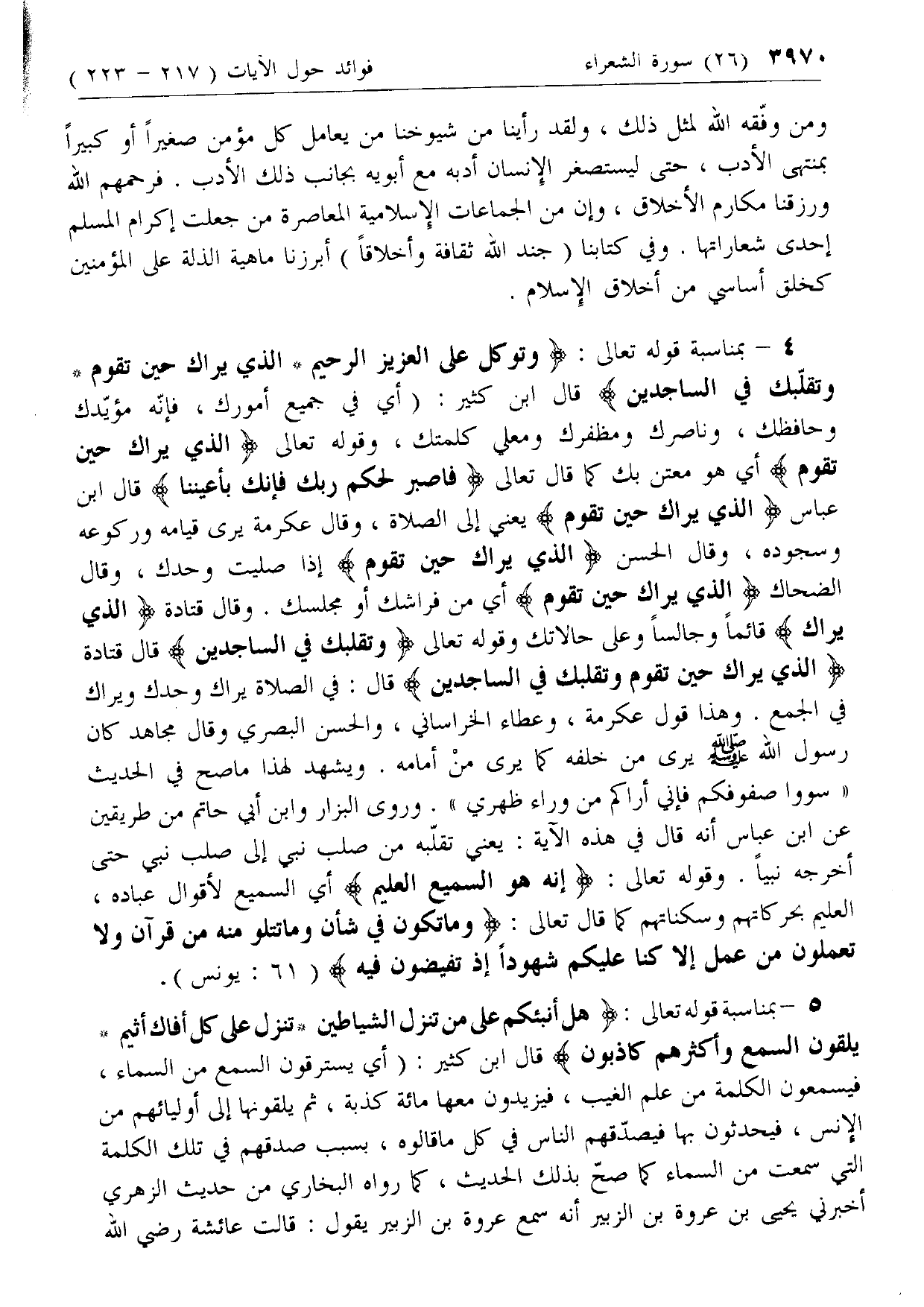 4 - بمناسبة قوله تعالى: وَتَوَكَّلْ عَلَى الْعَزِيزِ الرَّحِيمِ* الَّذِي يَراكَ حِينَ تَقُومُ* وَتَقَلُّبَكَ فِي السَّاجِدِينَ قال ابن كثير: (أي في جميع أمورك، فإنه مؤيدك وحافظك، وناصرك ومظفرك ومعلي كلمتك، وقوله تعالى الَّذِي يَراكَ حِينَ تَقُومُ أي هو معتن بك كما قال تعالى اصْبِرْ لِحُكْمِ رَبِّكَ فَإِنَّكَ بِأَعْيُنِنا قال ابن عباس الَّذِي يَراكَ حِينَ تَقُومُ يعني إلى الصلاة، وقال عكرمة يرى قيامه وركوعه وسجوده، وقال الحسن الَّذِي يَراكَ حِينَ تَقُومُ إذا صليت وحدك، وقال الضحاك الَّذِي يَراكَ حِينَ تَقُومُ أي من فراشك أو مجلسك. وقال قتادة الَّذِي يَراكَ قائما وجالسا وعلى حالاتك وقوله تعالى وَتَقَلُّبَكَ فِي السَّاجِدِينَ قال قتادة الَّذِي يَراكَ حِينَ تَقُومُ وَتَقَلُّبَكَ فِي السَّاجِدِينَ قال: في الصلاة يراك وحدك ويراك في الجمع. وهذا قول عكرمة، وعطاء الخراساني، والحسن البصري وقال مجاهد كان رسول الله صلى الله عليه وسلم يرى من خلفه كما يرى من أمامه. ويشهد لهذا ما صح في الحديث «سووا صفوفكم فإني أراكم من وراء ظهري». وروى البزار وابن أبي حاتم من طريقين عن ابن عباس أنه قال في هذه الآية: يعني تقلبه من صلب نبي إلى صلب نبي حتى أخرجه نبيا. وقوله تعالى: إِنَّهُ هُوَ السَّمِيعُ الْعَلِيمُ أي السميع لأقوال عباده، العليم بحركاتهم وسكناتهم كما قال تعالى: وَما تَكُونُ فِي شَأْنٍ وَما تَتْلُوا مِنْهُ مِنْ قُرْآنٍ وَلا تَعْمَلُونَ مِنْ عَمَلٍ إِلَّا كُنَّا عَلَيْكُمْ شُهُوداً إِذْ تُفِيضُونَ فِيهِ (61: يونس).