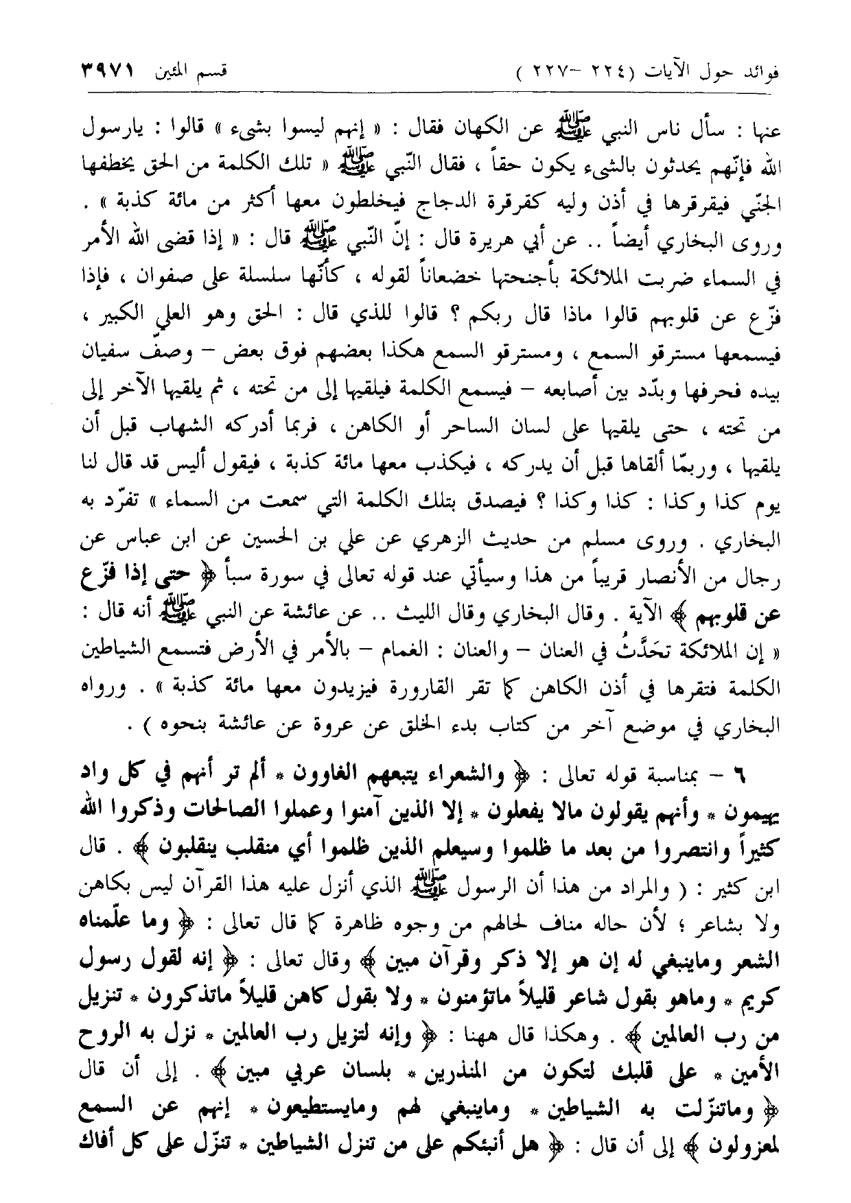 6 - بمناسبة قوله تعالى: وَالشُّعَراءُ يَتَّبِعُهُمُ الْغاوُونَ* أَلَمْ تَرَ أَنَّهُمْ فِي كُلِّ وادٍ يَهِيمُونَ* وَأَنَّهُمْ يَقُولُونَ ما لا يَفْعَلُونَ* إِلَّا الَّذِينَ آمَنُوا وَعَمِلُوا الصَّالِحاتِ وَذَكَرُوا اللَّهَ كَثِيراً وَانْتَصَرُوا مِنْ بَعْدِ ما ظُلِمُوا وَسَيَعْلَمُ الَّذِينَ ظَلَمُوا أَيَّ مُنْقَلَبٍ يَنْقَلِبُونَ. قال ابن كثير: (والمراد من هذا أن الرسول صلى الله عليه وسلم الذي أنزل عليه هذا القرآن ليس بكاهن ولا بشاعر؛ لأن حاله مناف لحالهم من وجوه ظاهرة كما قال تعالى: وَما عَلَّمْناهُ الشِّعْرَ وَما يَنْبَغِي لَهُ إِنْ هُوَ إِلَّا ذِكْرٌ وَقُرْآنٌ مُبِينٌ وقال تعالى: إِنَّهُ لَقَوْلُ رَسُولٍ كَرِيمٍ* وَما هُوَ بِقَوْلِ شاعِرٍ قَلِيلًا ما تُؤْمِنُونَ* وَلا بِقَوْلِ كاهِنٍ قَلِيلًا ما تَذَكَّرُونَ* تَنْزِيلٌ مِنْ رَبِّ الْعالَمِينَ. وهكذا قال هاهنا: وَإِنَّهُ لَتَنْزِيلُ رَبِّ الْعالَمِينَ* نَزَلَ بِهِ الرُّوحُ الْأَمِينُ* عَلى قَلْبِكَ لِتَكُونَ مِنَ الْمُنْذِرِينَ* بِلِسانٍ عَرَبِيٍّ مُبِينٍ. إلى أن قال وَما تَنَزَّلَتْ بِهِ الشَّياطِينُ* وَما يَنْبَغِي لَهُمْ وَما يَسْتَطِيعُونَ* إِنَّهُمْ عَنِ السَّمْعِ لَمَعْزُولُونَ إلى أن قال: هَلْ أُنَبِّئُكُمْ عَلى مَنْ تَنَزَّلُ الشَّياطِينُ* تَنَزَّلُ عَلى كُلِّ أَفَّاكٍ