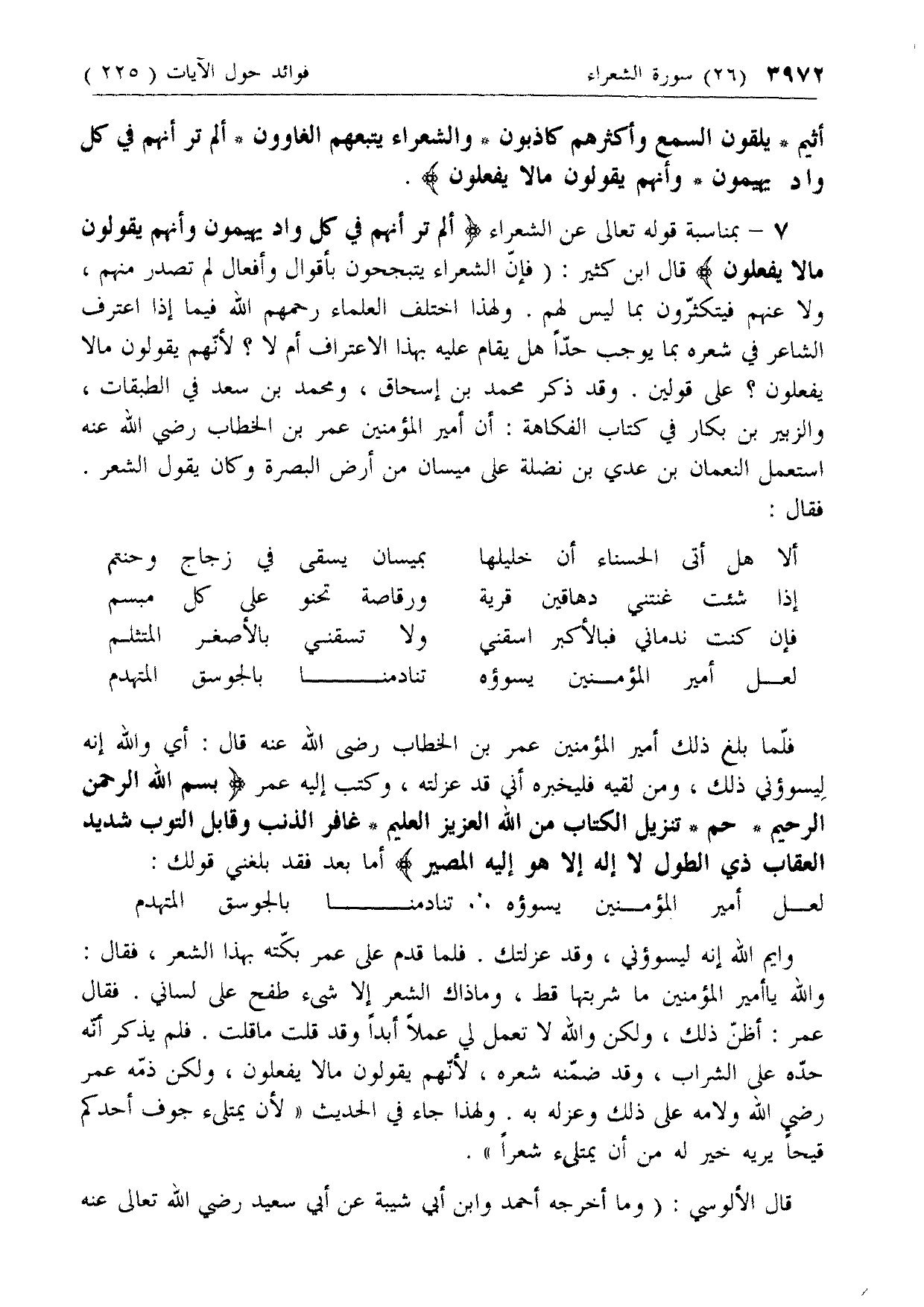 7 - بمناسبة قوله تعالى عن الشعراء أَلَمْ تَرَ أَنَّهُمْ فِي كُلِّ وادٍ يَهِيمُونَ وَأَنَّهُمْ يَقُولُونَ ما لا يَفْعَلُونَ قال ابن كثير: (فإن الشعراء يتبجحون بأقوال وأفعال لم تصدر منهم، ولا عنهم فيتكثرون بما ليس لهم. ولهذا اختلف العلماء رحمهم الله فيما إذا اعترف الشاعر في شعره بما يوجب حدا هل يقام عليه بهذا الاعتراف أم لا؟ لأنهم يقولون ما لا