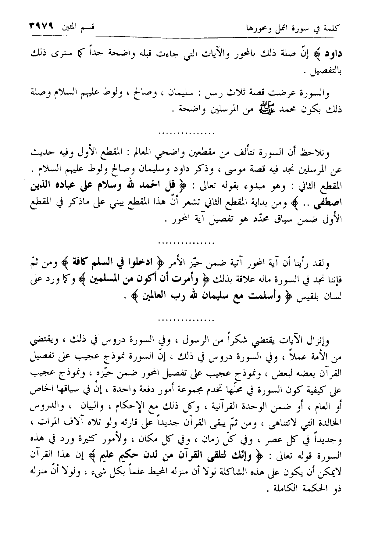 المقطع الثاني: وهو مبدوء بقوله تعالى: قُلِ الْحَمْدُ لِلَّهِ وَسَلامٌ عَلى عِبادِهِ الَّذِينَ اصْطَفى .. ومن بداية المقطع الثاني تشعر أن هذا المقطع يبني على ما ذكر في المقطع الأول ضمن سياق محدد هو تفصيل آية المحور.
