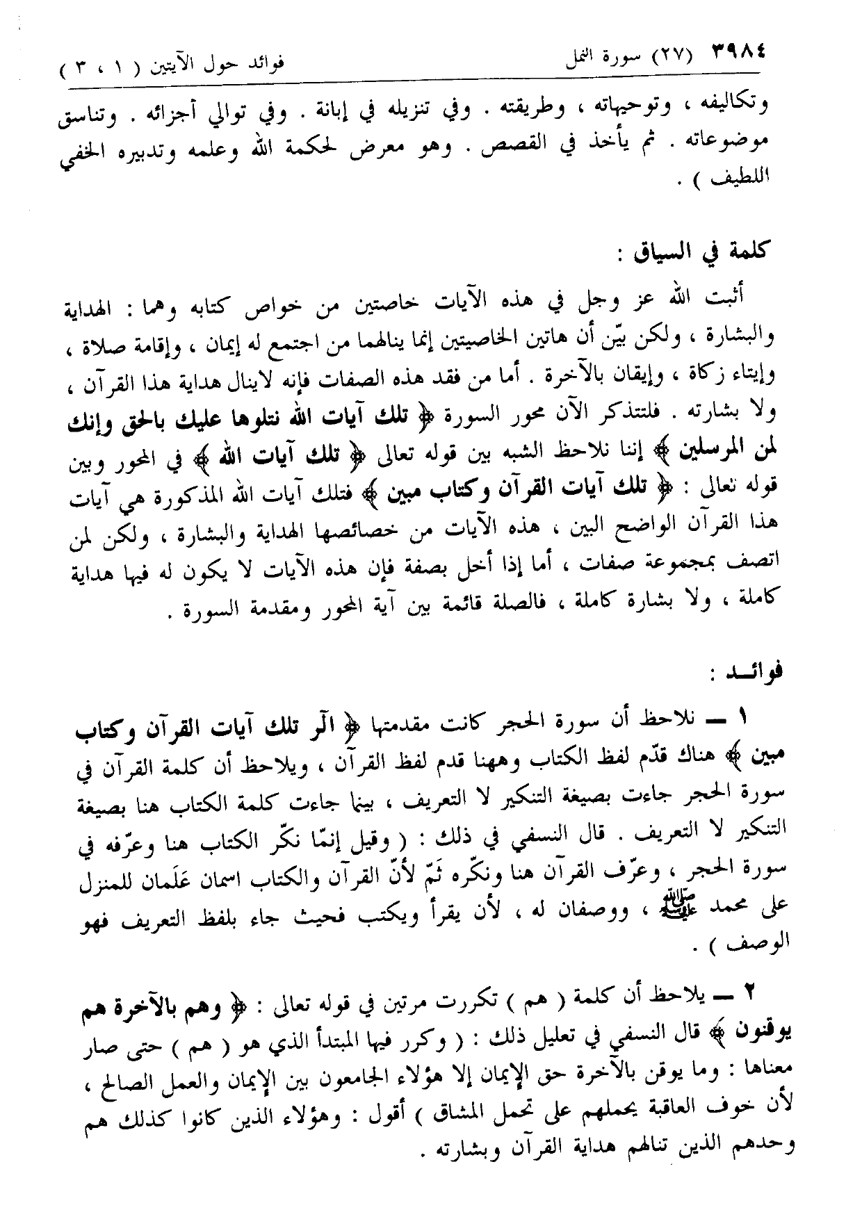 أثبت الله عزّ وجل في هذه الآيات خاصتين من خواص كتابه وهما: الهداية والبشارة، ولكن بين أن هاتين الخاصيتين إنما ينالهما من اجتمع له إيمان، وإقامة صلاة، وإيتاء زكاة، وإيقان بالآخرة. أما من فقد هذه الصفات فإنه لا ينال هداية هذا القرآن، ولا بشارته. فلتتذكر الآن محور السورة تِلْكَ آياتُ اللَّهِ نَتْلُوها عَلَيْكَ بِالْحَقِّ وَإِنَّكَ لَمِنَ الْمُرْسَلِينَ إننا نلاحظ الشبه بين قوله تعالى تِلْكَ آياتُ اللَّهِ في المحور وبين قوله تعالى: تِلْكَ آياتُ الْقُرْآنِ وَكِتابٍ مُبِينٍ فتلك آيات الله المذكورة هي آيات هذا القرآن الواضح البين، هذه الآيات من خصائصها الهداية والبشارة، ولكن لمن اتصف بمجموعة صفات، أما إذا أخل بصفة فإن هذه الآيات لا يكون له فيها هداية كاملة، ولا بشارة كاملة، فالصلة قائمة بين آية المحور ومقدمة السورة.