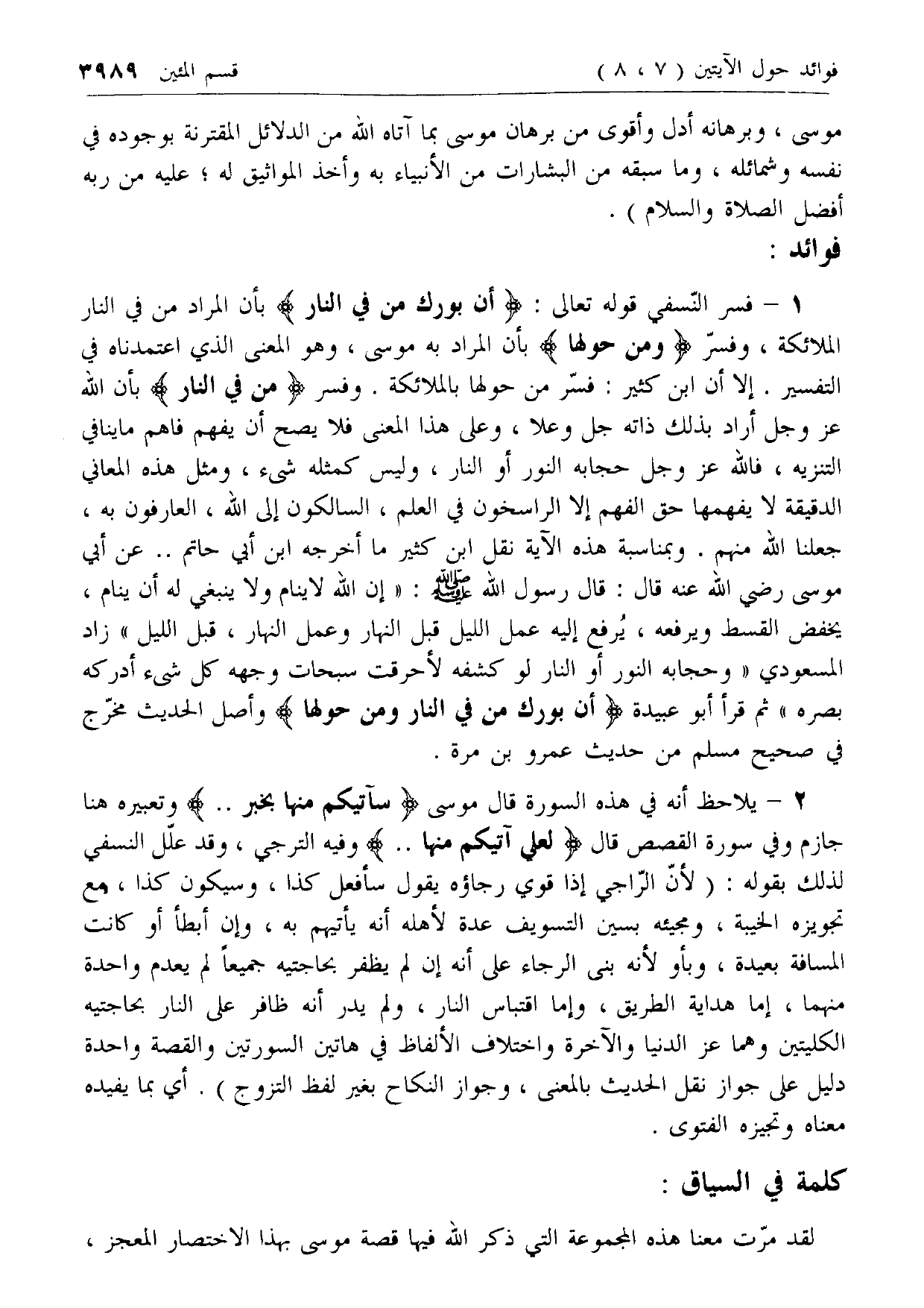 1 - فسر النسفي قوله تعالى: أَنْ بُورِكَ مَنْ فِي النَّارِ بأن المراد من في النار الملائكة، وفسر وَمَنْ حَوْلَها بأن المراد به موسى، وهو المعنى الذي اعتمدناه في التفسير. إلا أن ابن كثير: فسر من حولها بالملائكة. وفسر مَنْ فِي النَّارِ بأن الله عزّ وجل أراد بذلك ذاته جل وعلا، وعلى هذا المعنى فلا يصح أن يفهم فاهم ما ينافي التنزيه، فالله عزّ وجل حجابه النور أو النار، وليس كمثله شئ، ومثل هذه المعاني الدقيقة لا يفهمها حق الفهم إلا الراسخون في العلم، السالكون إلى الله، العارفون به، جعلنا الله منهم. وبمناسبة هذه الآية نقل ابن كثير ما أخرجه ابن أبي حاتم .. عن أبي موسى رضي الله عنه قال: قال رسول الله صلى الله عليه وسلم: «إن الله لا ينام ولا ينبغي له أن ينام، يخفض القسط ويرفعه، يرفع إليه عمل الليل قبل النهار وعمل النهار، قبل الليل» زاد المسعودي «وحجابه النور أو النار لو كشفه لأحرقت سبحات وجهه كل شئ أدركه بصره» ثم قرأ أبو عبيدة أَنْ بُورِكَ مَنْ فِي النَّارِ وَمَنْ حَوْلَها وأصل الحديث مخرج في صحيح مسلم من حديث عمرو بن مرة.
