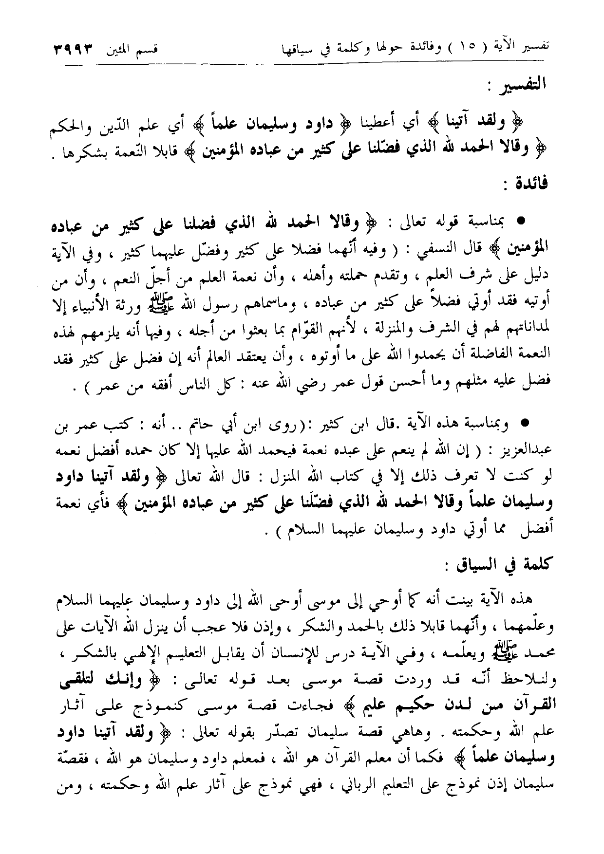 بمناسبة قوله تعالى: وَقالا الْحَمْدُ لِلَّهِ الَّذِي فَضَّلَنا عَلى كَثِيرٍ مِنْ عِبادِهِ الْمُؤْمِنِينَ قال النسفي: (وفيه أنهما فضلا على كثير وفضل عليهما كثير، وفي الآية دليل على شرف العلم، وتقدم حملته وأهله، وأن نعمة العلم من أجل النعم، وأن من أوتيه فقد أوتي فضلا على كثير من عباده، وما سماهم رسول الله صلى الله عليه وسلم ورثة الأنبياء إلا لمداناتهم لهم في الشرف والمنزلة، لأنهم القوام بما بعثوا من أجله، وفيها أنه يلزمهم لهذه النعمة الفاضلة أن يحمدوا الله على ما أوتوه، وأن يعتقد العالم أنه إن فضل على كثير فقد فضل عليه مثلهم وما أحسن قول عمر رضي الله عنه: كل الناس أفقه من عمر).