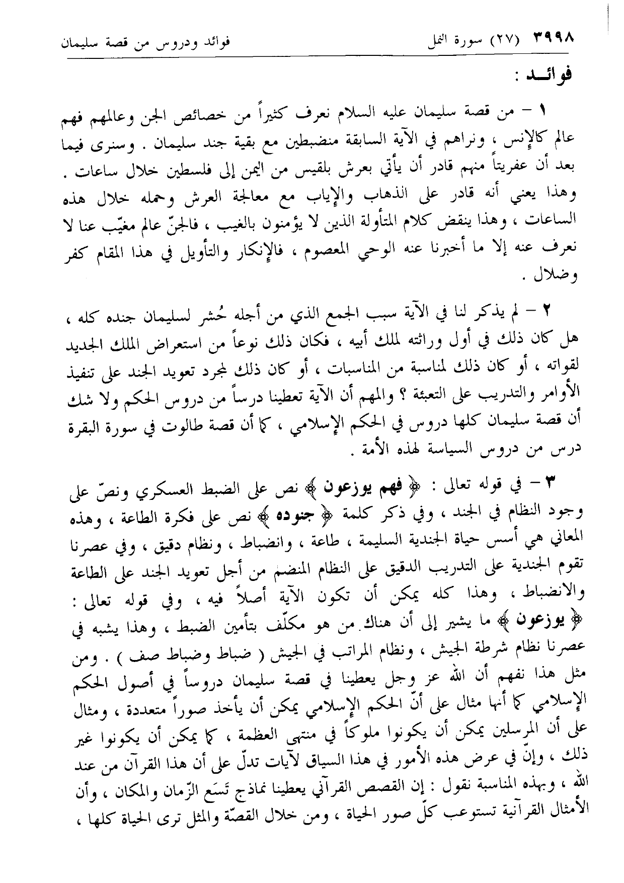يُوزَعُونَ ما يشير إلى أن هناك من هو مكلف بتأمين الضبط، وهذا يشبه في عصرنا نظام شرطة الجيش، ونظام المراتب في الجيش (ضباط وضباط صف). ومن مثل هذا نفهم أن الله عزّ وجل يعطينا في قصة سليمان دروسا في أصول الحكم الإسلامي كما أنها مثال على أن الحكم الإسلامي يمكن أن يأخذ صورا متعددة، ومثال على أن المرسلين يمكن أن يكونوا ملوكا في منتهى العظمة، كما يمكن أن يكونوا غير ذلك، وإن في عرض هذه الأمور في هذا السياق لآيات تدل على أن هذا القرآن من عند الله، وبهذه المناسبة نقول: إن القصص القرآني يعطينا نماذج تسع الزمان والمكان، وأن الأمثال القرآنية تستوعب كل صور الحياة، ومن خلال القصة والمثل ترى الحياة كلها،