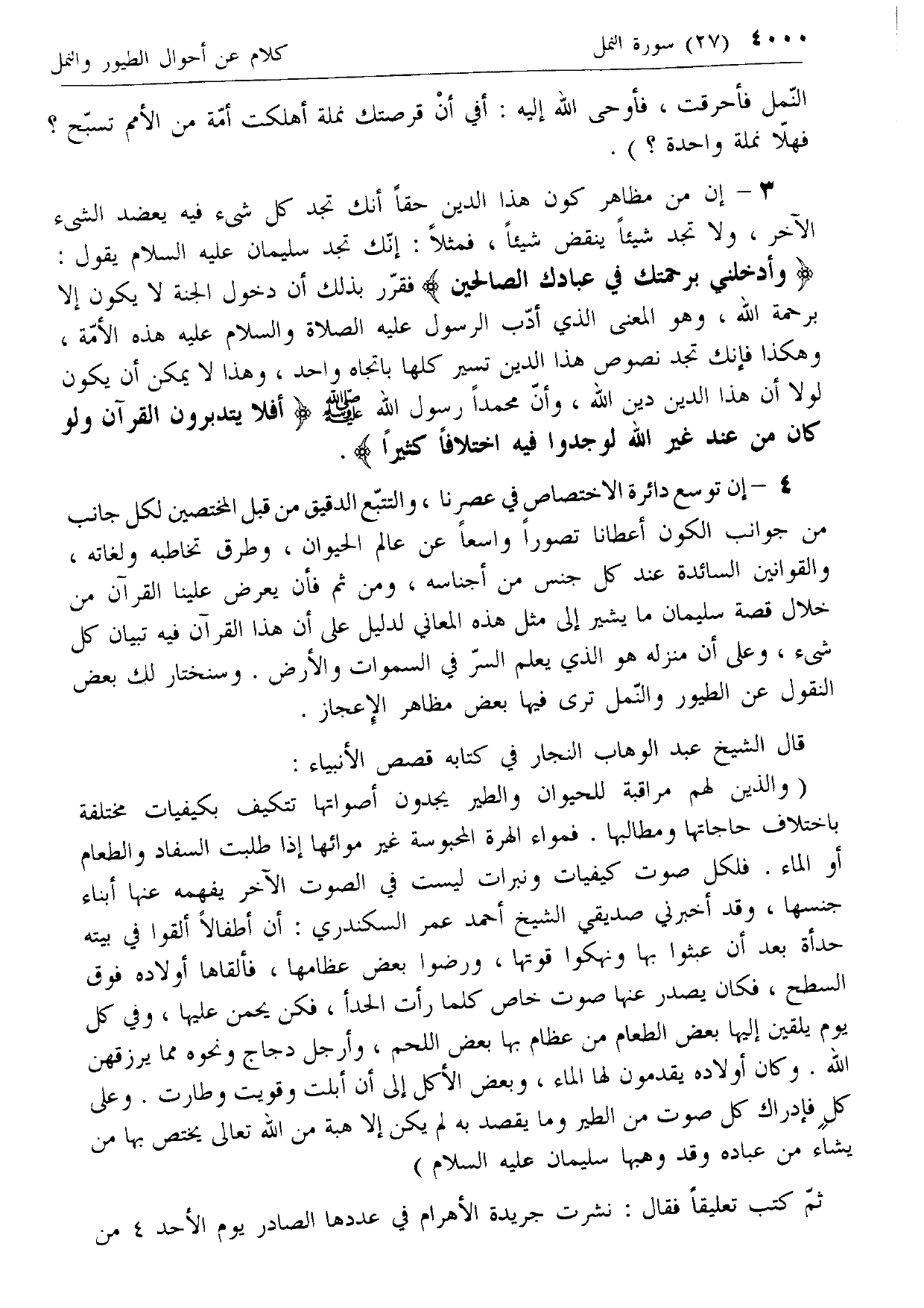 (والذين لهم مراقبة للحيوان والطير يجدون أصواتها تتكيف بكيفيات مختلفة باختلاف حاجاتها ومطالبها. فمواء الهرة المحبوسة غير موائها إذا طلبت السفاد والطعام أو الماء. فلكل صوت كيفيات ونبرات ليست في الصوت الآخر يفهمه عنها أبناء جنسها، وقد أخبرني صديقي الشيخ أحمد عمر السكندري: أن أطفالا ألقوا في بيته حدأة بعد أن عبثوا بها ونهكوا قوتها، ورضوا بعض عظامها، فألقاها أولاده فوق السطح، فكان يصدر عنها صوت خاص كلما رأت الحدأ، فكن يحمن عليها، وفي كل يوم يلقين إليها بعض الطعام من عظام بها بعض اللحم، وأرجل دجاج ونحوه مما يرزقهن الله. وكان أولاده يقدمون لها الماء، وبعض الأكل إلى أن أبلت وقويت وطارت. وعلى كل فإدراك كل صوت من الطير وما يقصد به لم يكن إلا هبة من الله تعالى يختص بها من يشاء من عباده وقد وهبها سليمان عليه السلام)