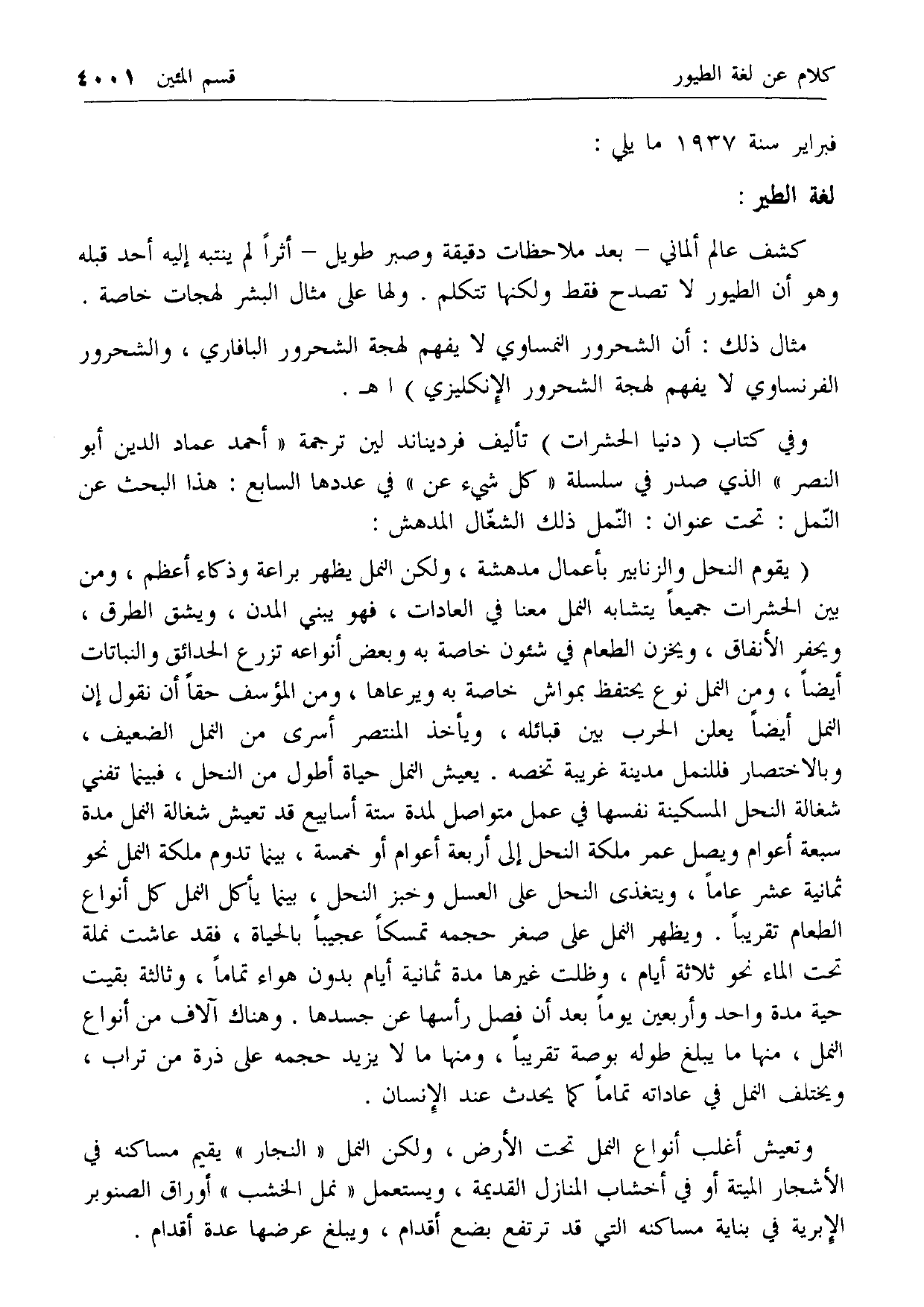وفي كتاب (دنيا الحشرات) تأليف فرديناند لين ترجمة «أحمد عماد الدين أبو النصر» الذي صدر في سلسلة «كل شيء عن» في عددها السابع: هذا البحث عن النمل: تحت عنوان: النمل ذلك الشغال المدهش: